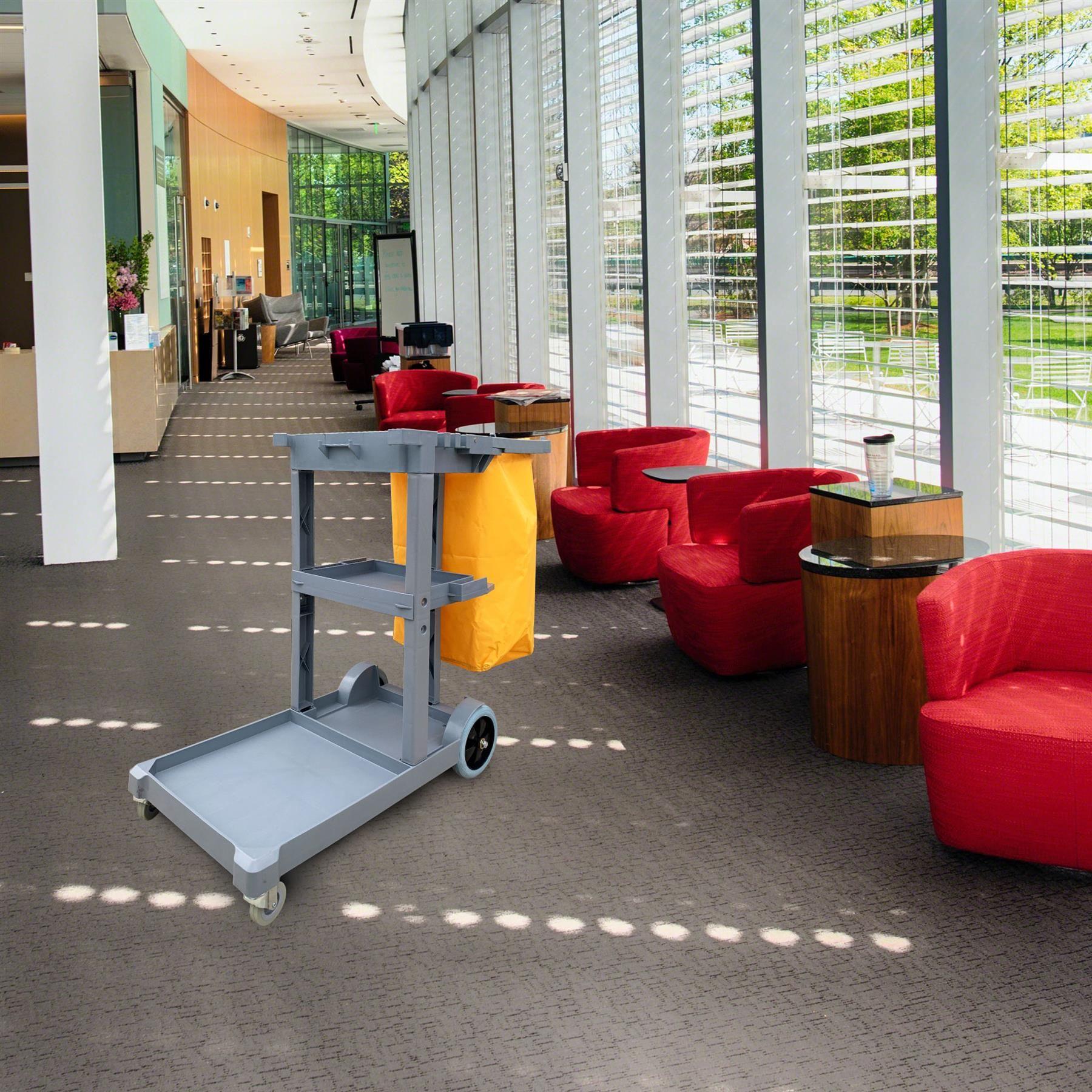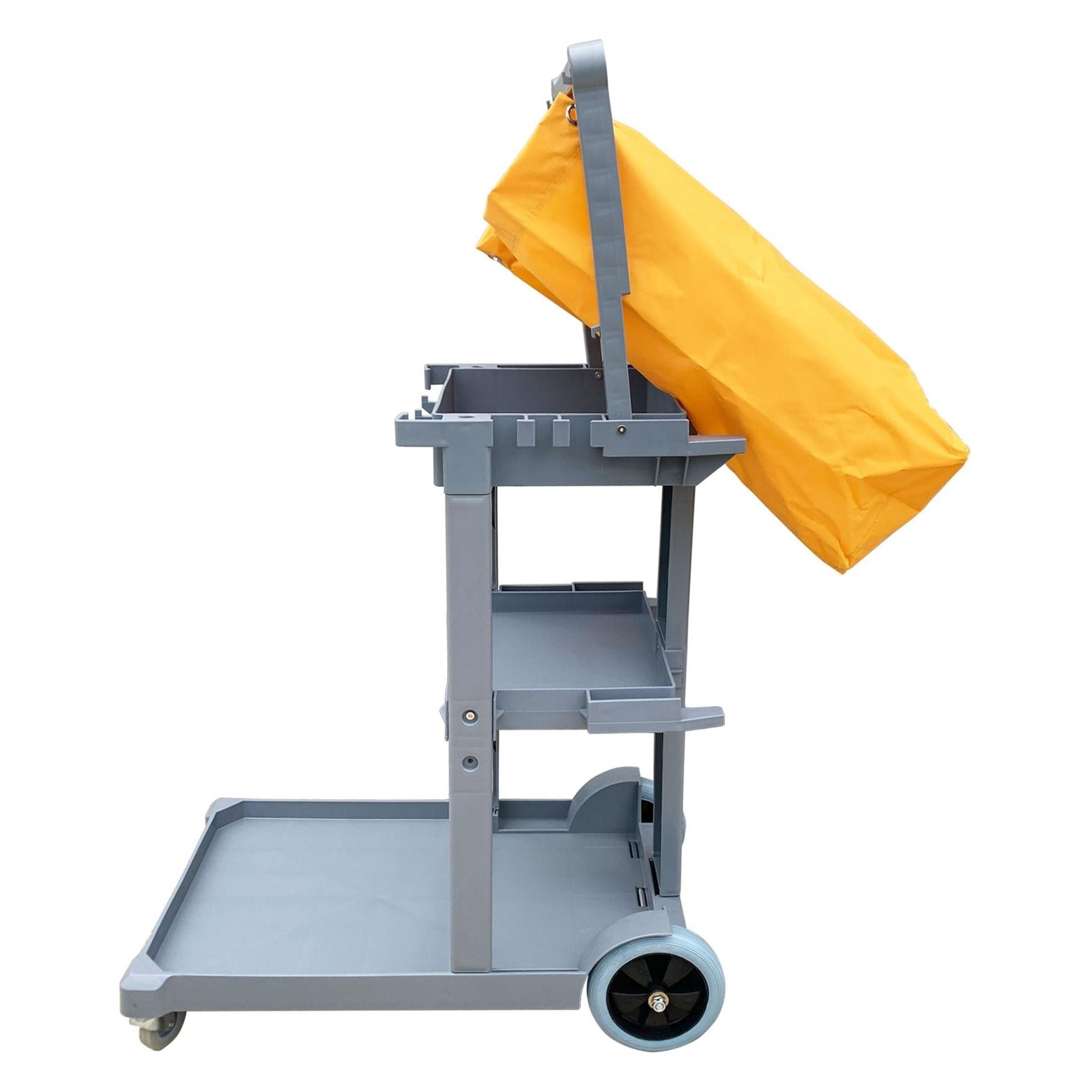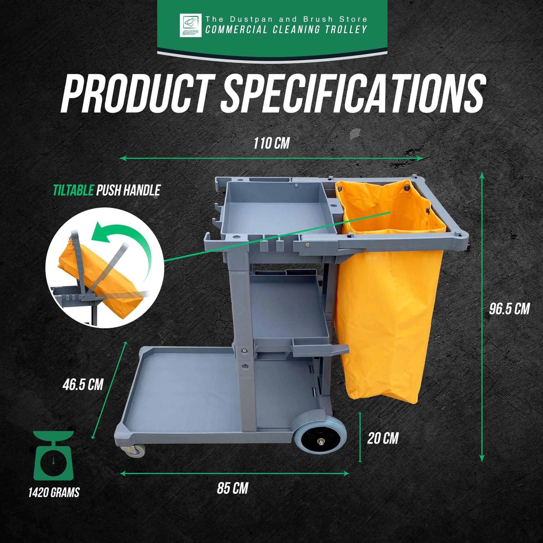 - Spacious Cleaning Cart – The cleaning trolley, which is 96.5cm high, 110cm long, and 46.5cm wide, has 3 levels of storage space for cleaning tools. It has a large front platform that can hold mop buckets, notice boards, and other janitorial & sanitation supplies.