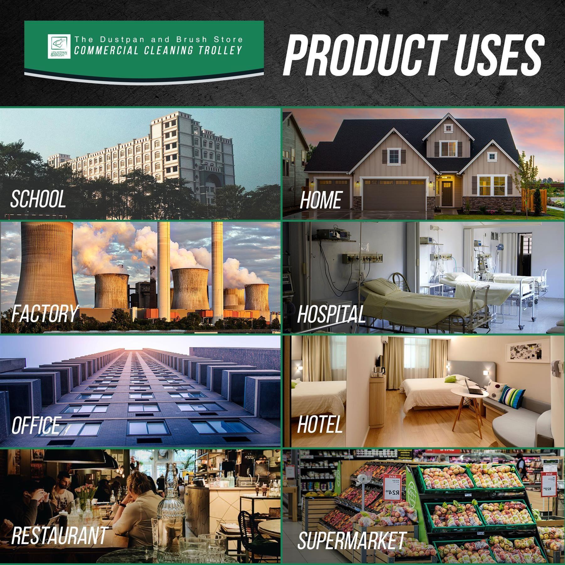 - Multipurpose Cleaning Trolley Professional – This is suitable for use in schools, offices, hotels, airports, and shops. The collapsible trolley with wheels is easy to assemble or disassemble to save time and storage space.