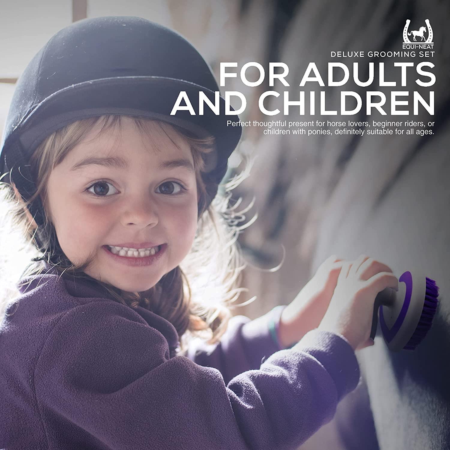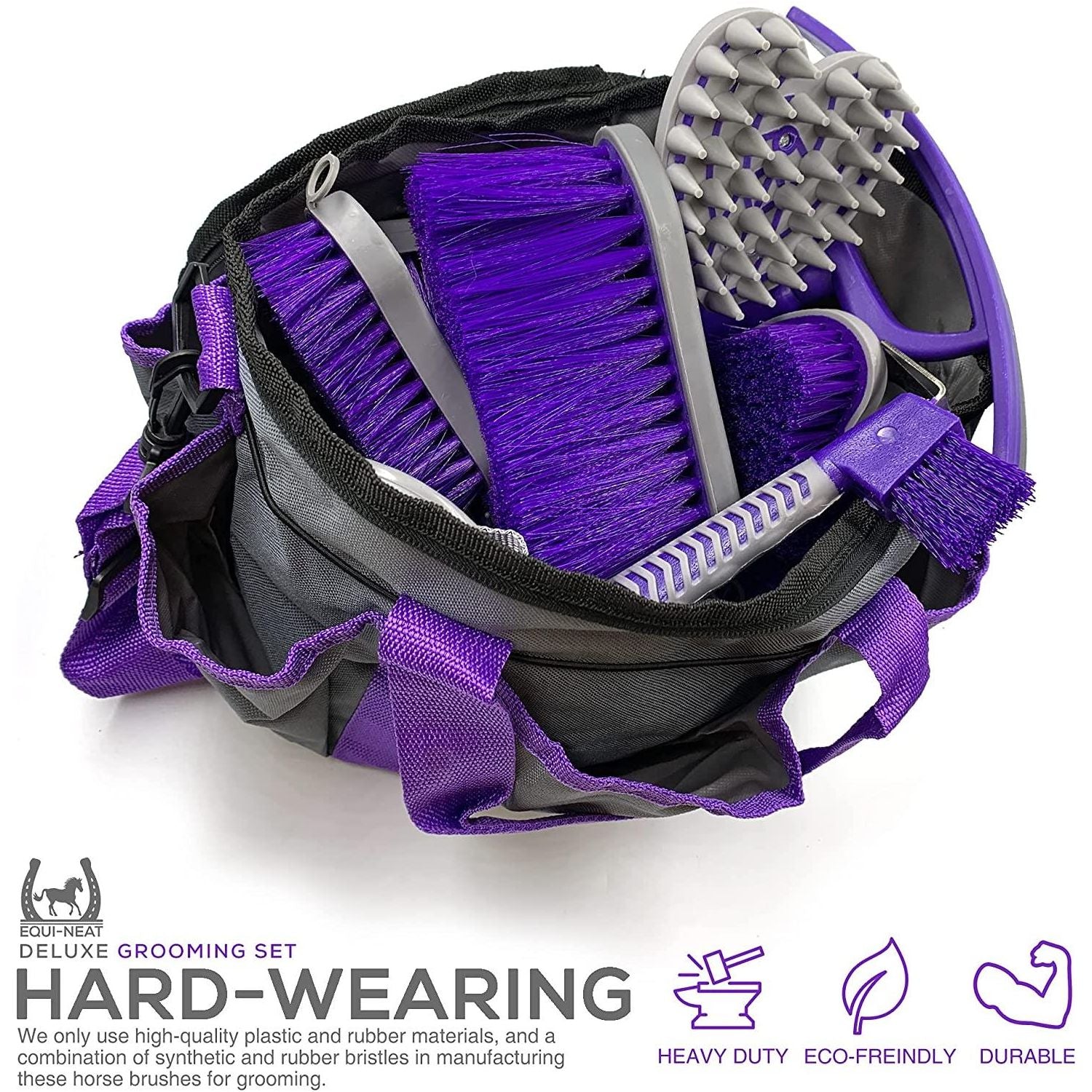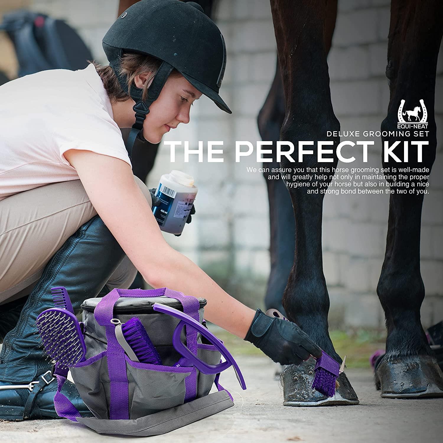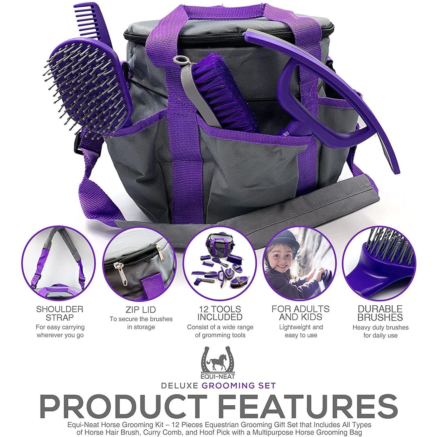 Includes mane and tail horse brush, large mane comb, small mane comb, hoof and face brush, flexi curry comb, coarse curry comb, hoof pick, body groom brush, body brush, flick brush, sweat scraper, and a grooming kit bag.