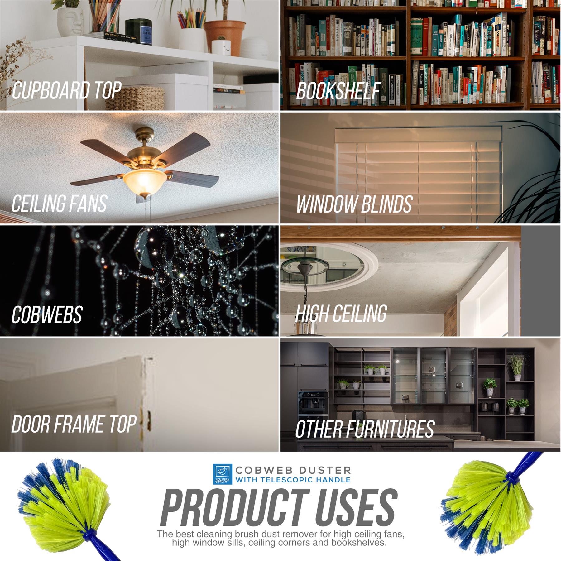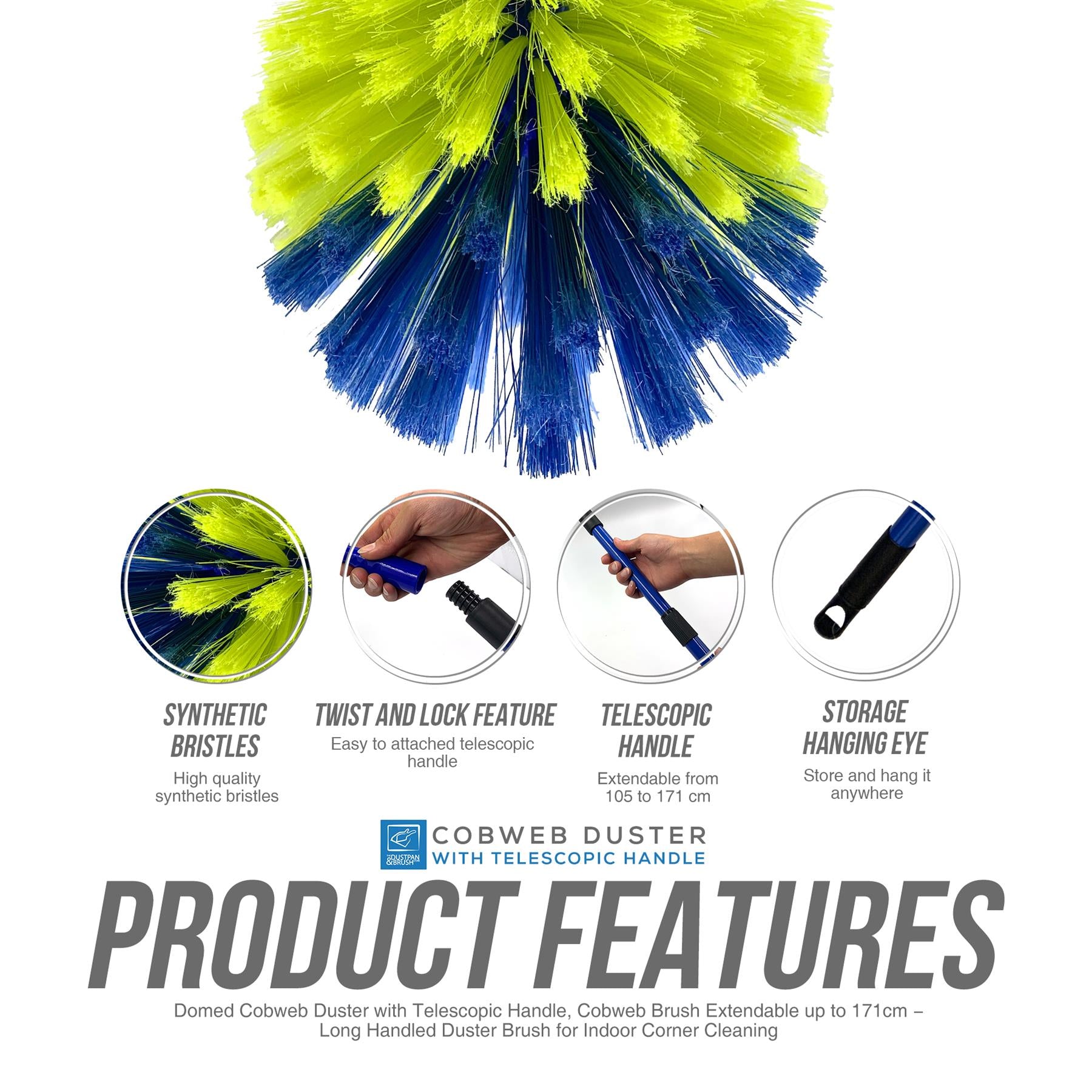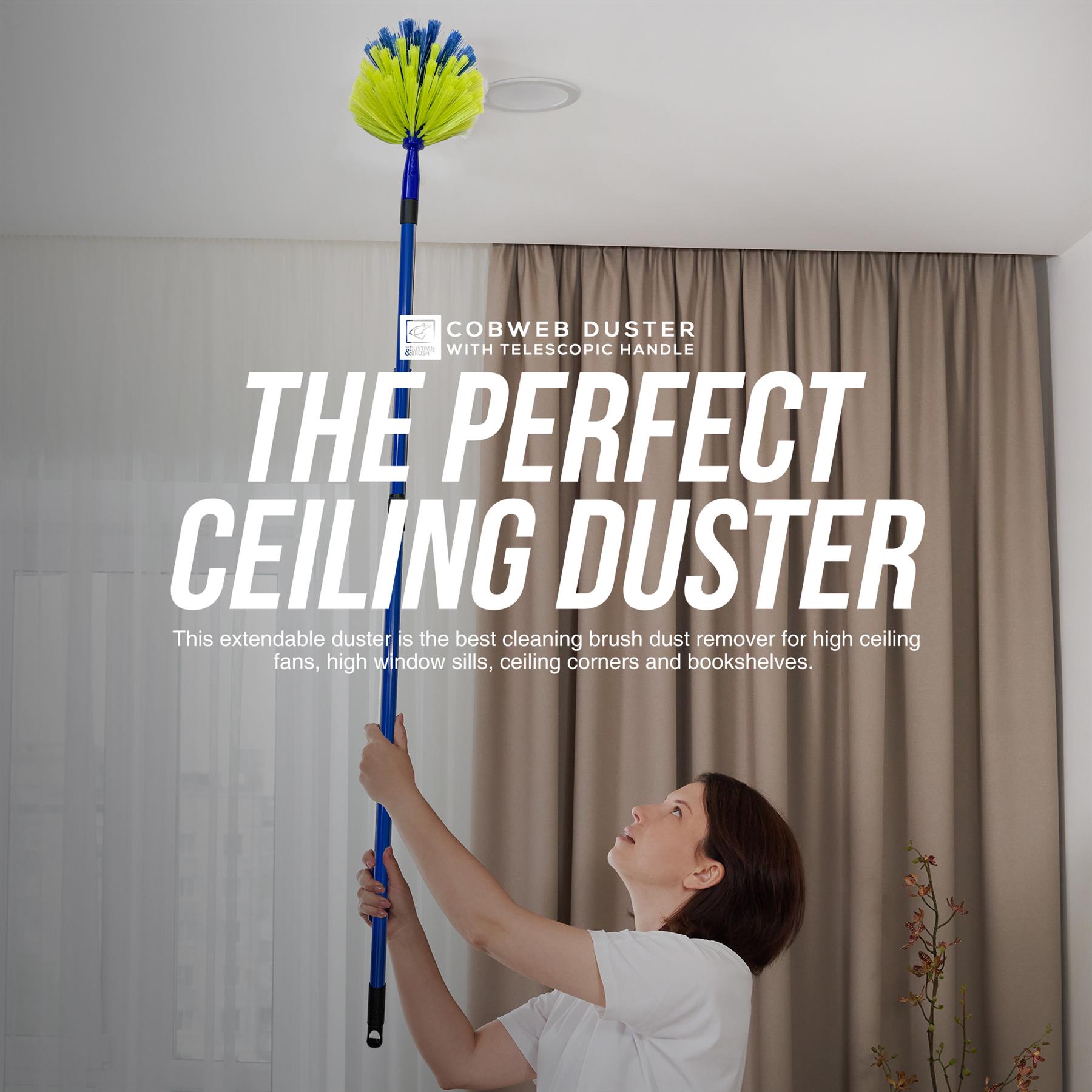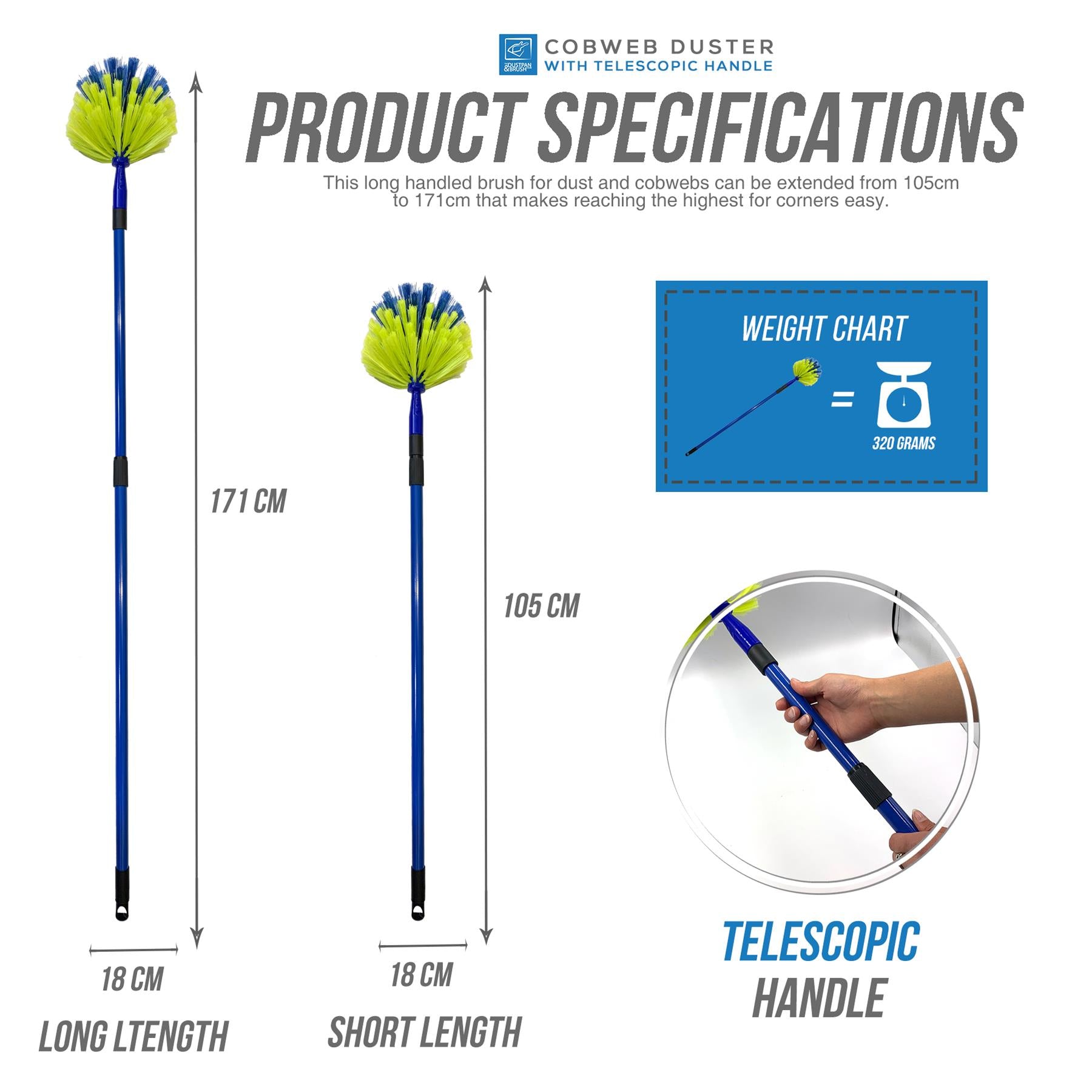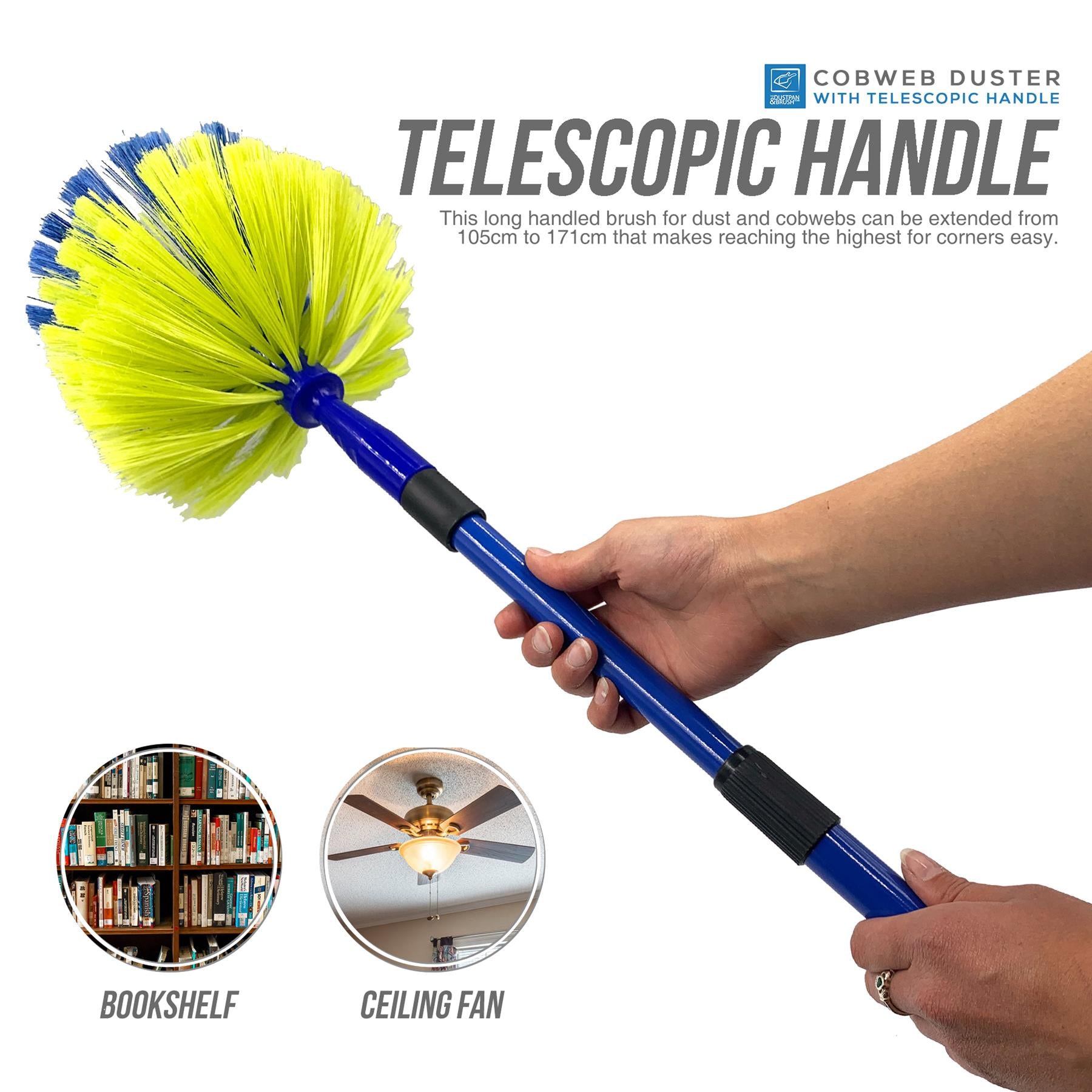 The overall cobweb brush extends from appox. 105cm to 171cm plus the long reach of your arms; this creates a great distance for you to reach most high ceilings, shelves or windows.