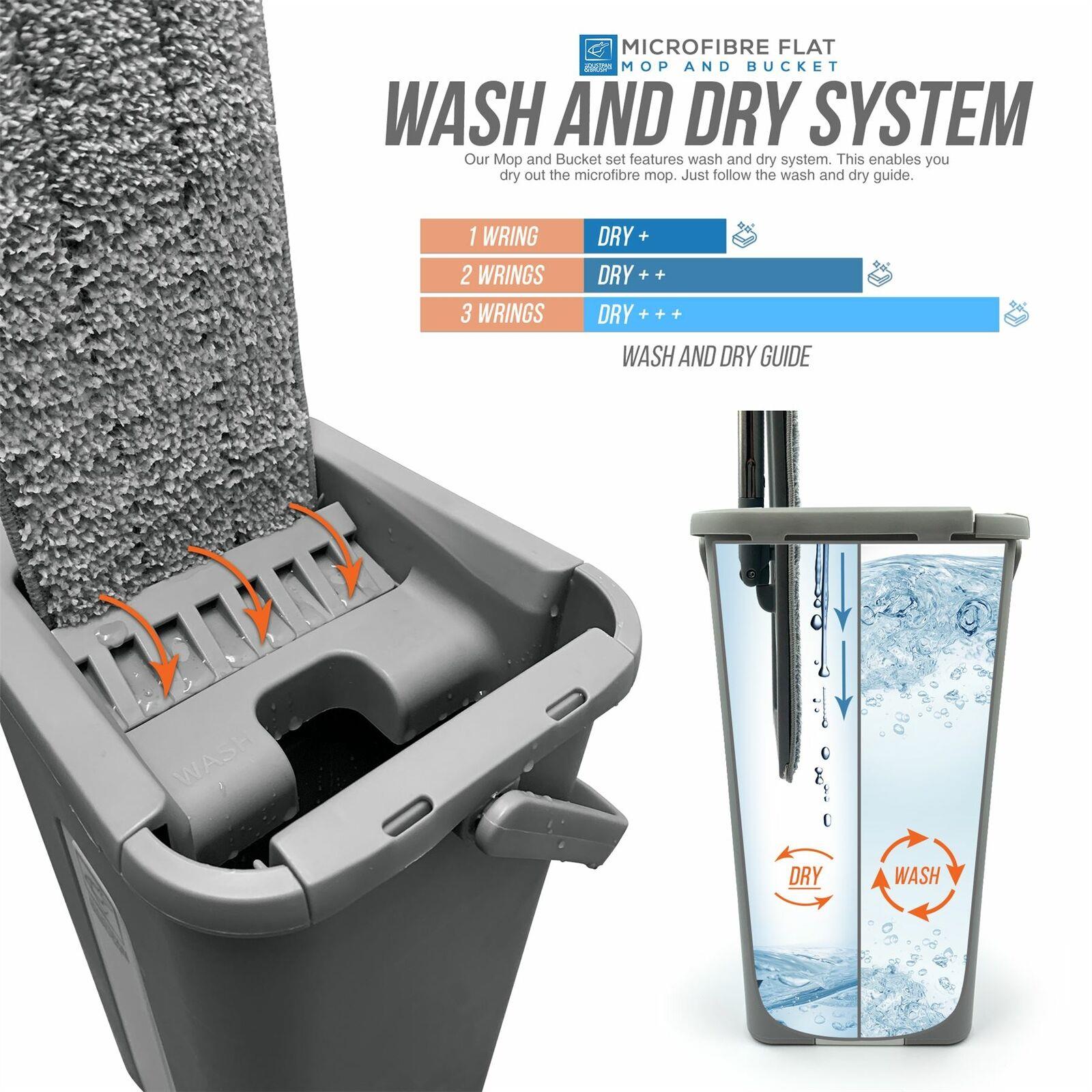 Easy squeeze mop wringer removes excess water from the flat mop head ensuring your floor does not end up soaked.