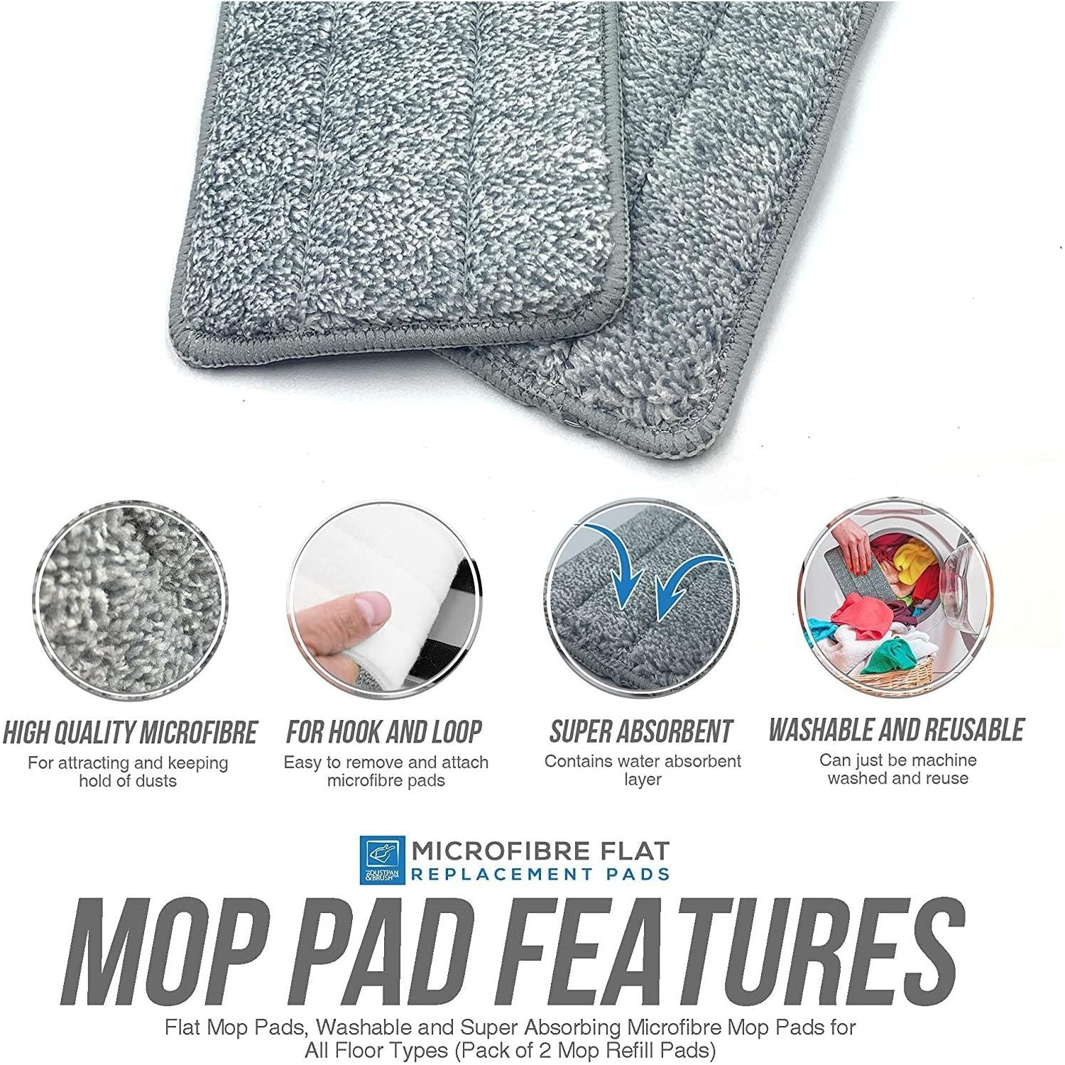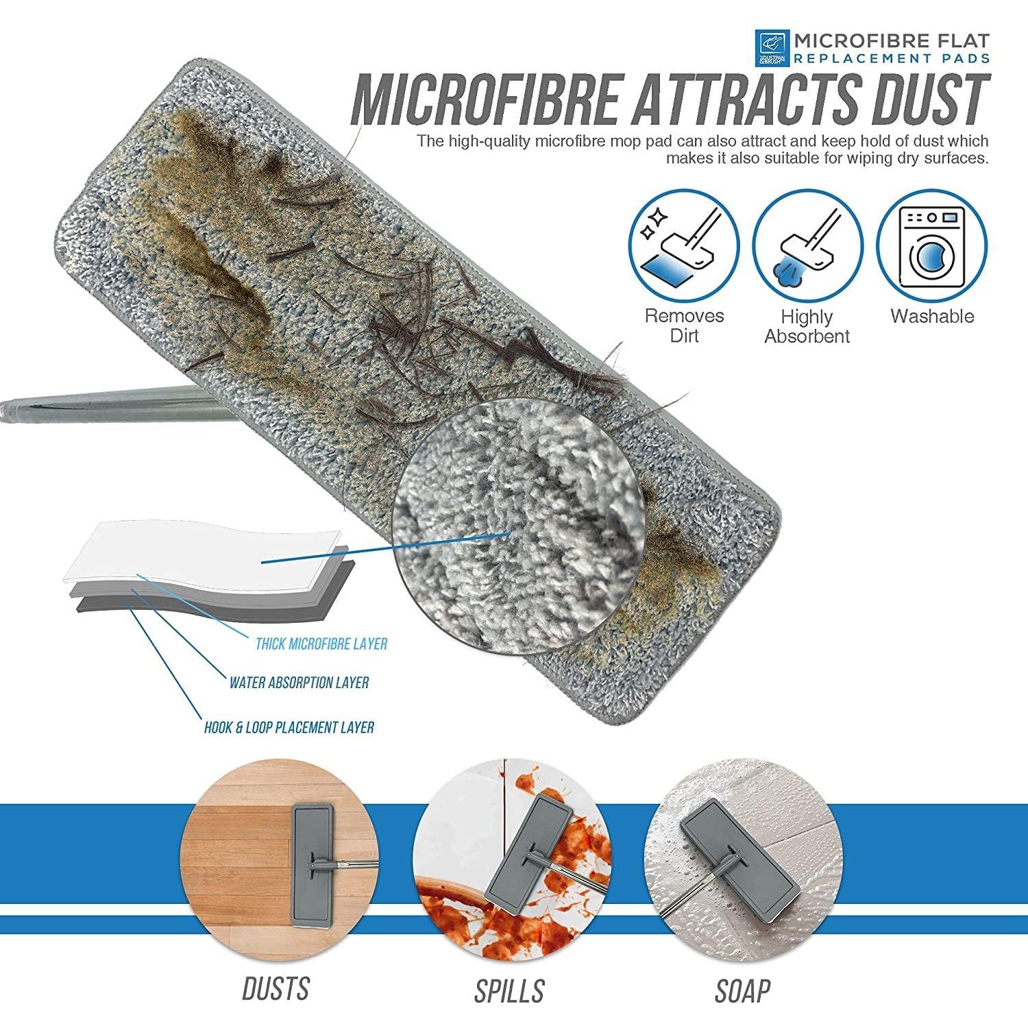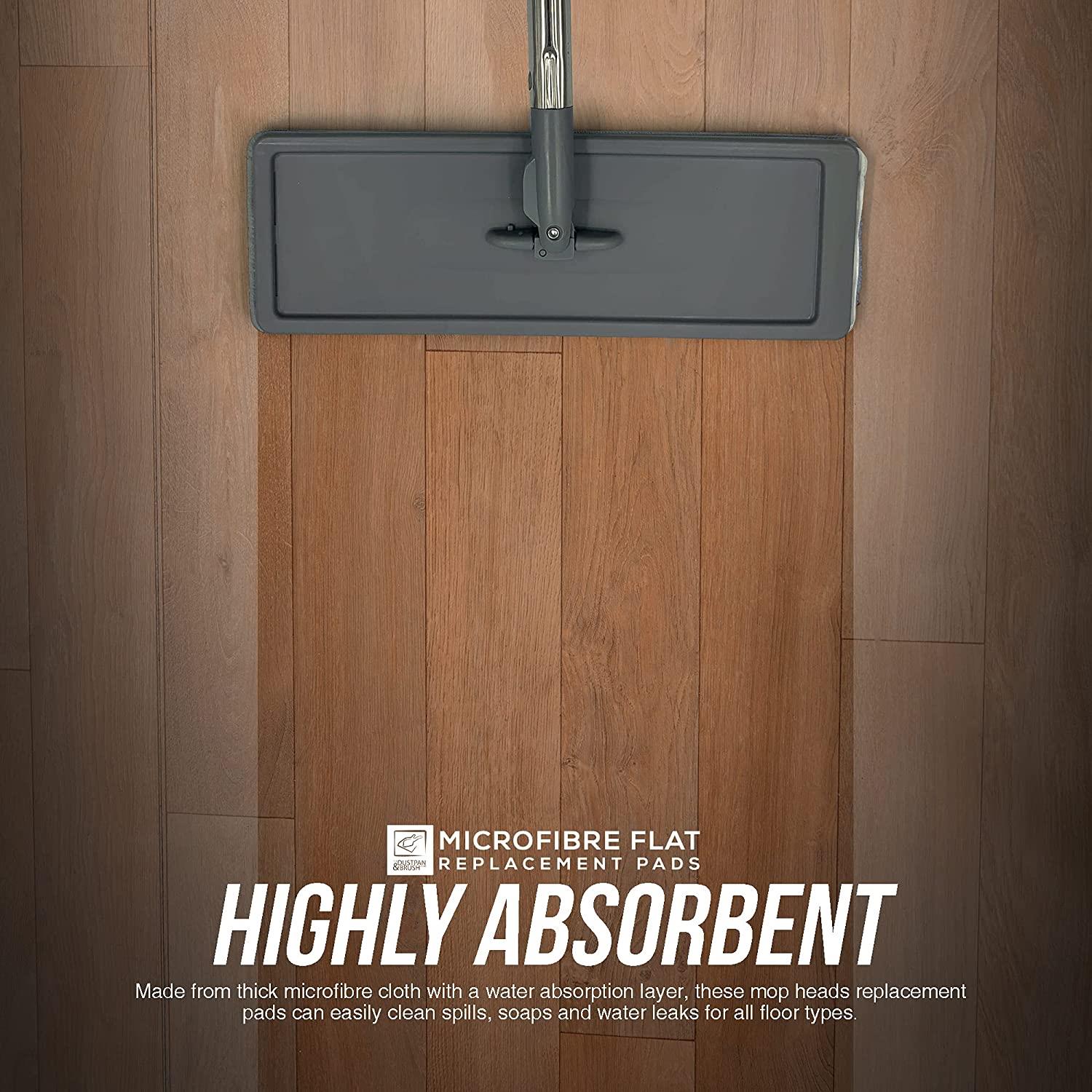 - Super Absorbent Flat Mop Head Refills – Made from thick microfibre cloth with a water absorption layer, these mop heads replacement pads can easily clean spills, soaps and water leaks for all floor types. The high-quality microfibre mop pad can also attract and keep hold of dust which makes it also suitable for wiping dry surfaces.