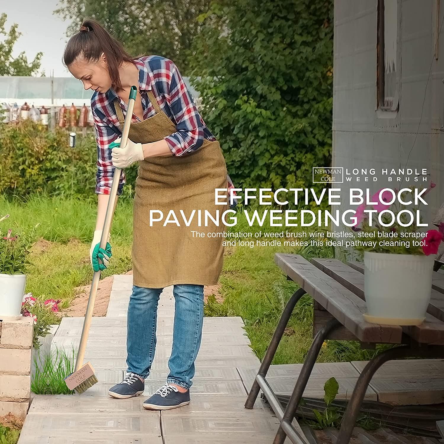 - Effective Block Paving Weeding Tool – Clean up your patios, garden, block paving and driveway with this sturdy patio brush wire. The combination of weed brush wire bristles, steel blade scraper and long handle makes this ideal driveway cleaning tool. The angled bristles of the block paving brush perfectly fit in the cracks and spaces in between the patio paving stones to remove all unwanted moss and weeds.