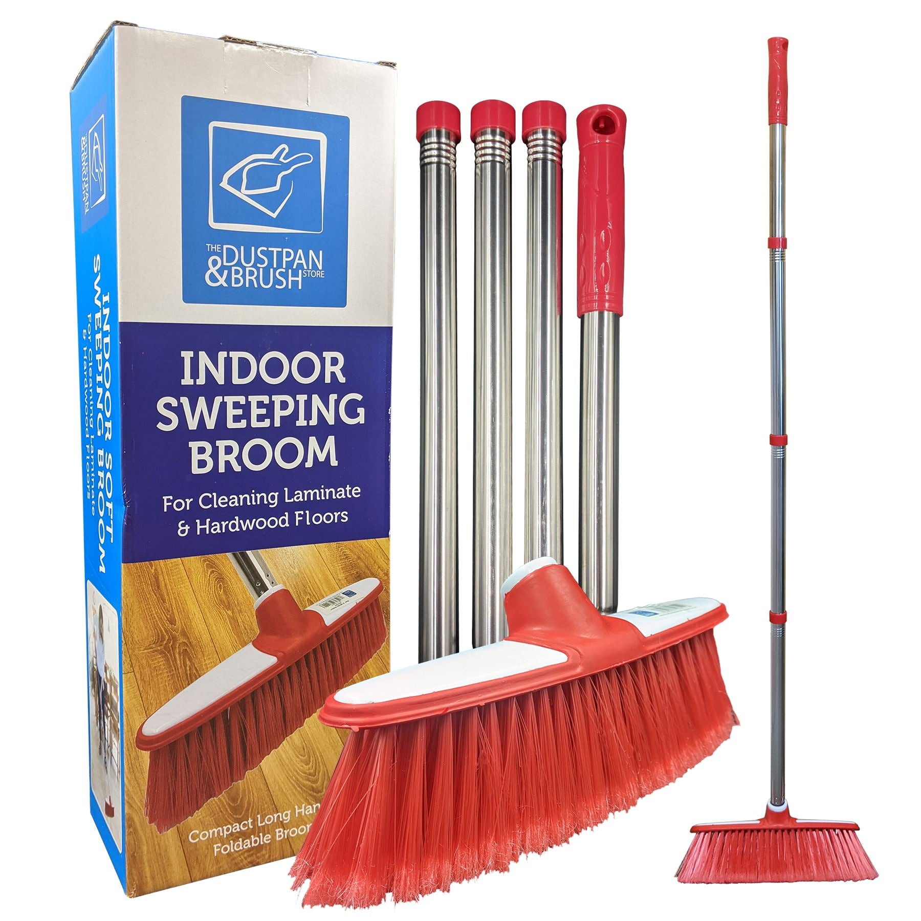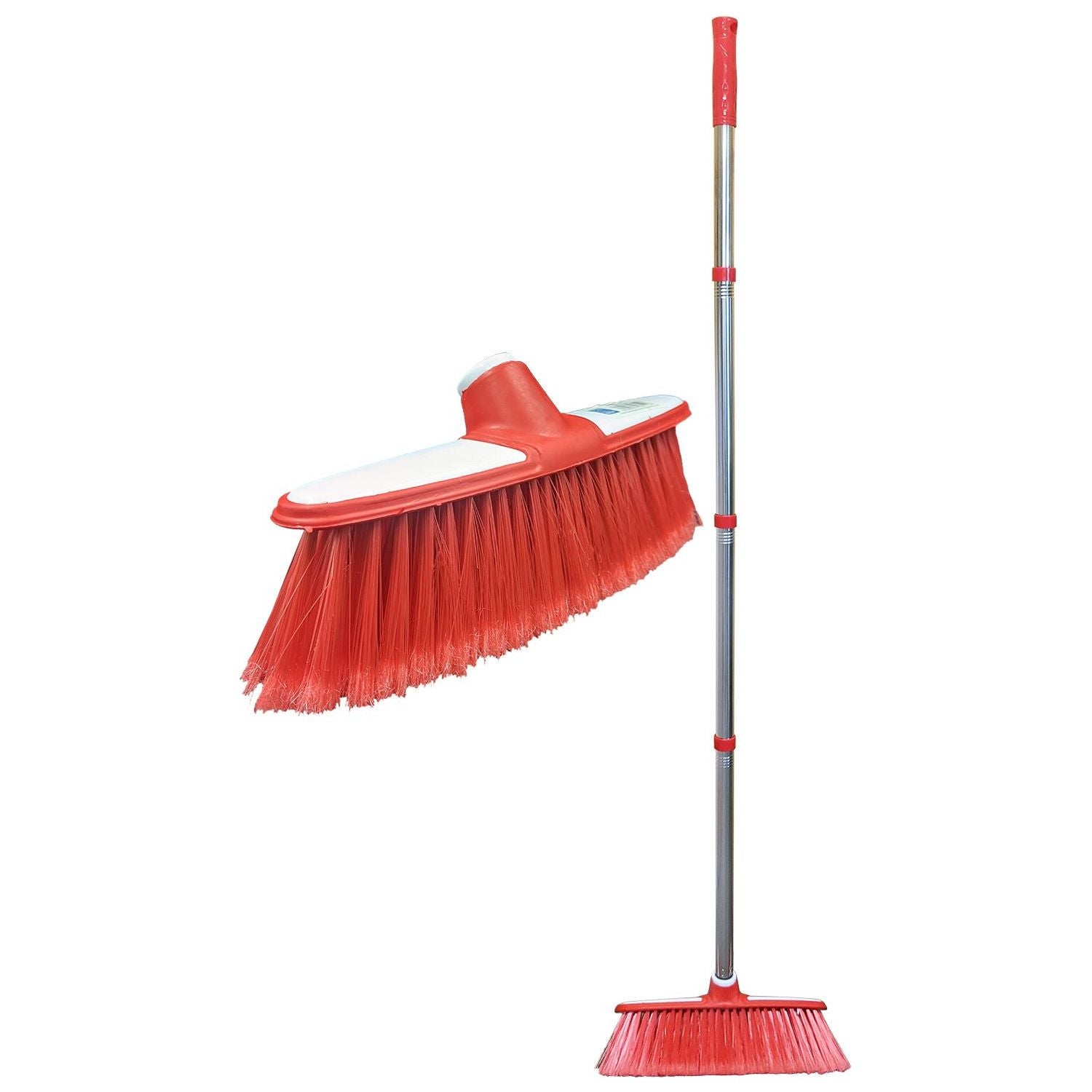 Multi section telescopic / collapsible screw fit stainless steel handle and soft broom head .