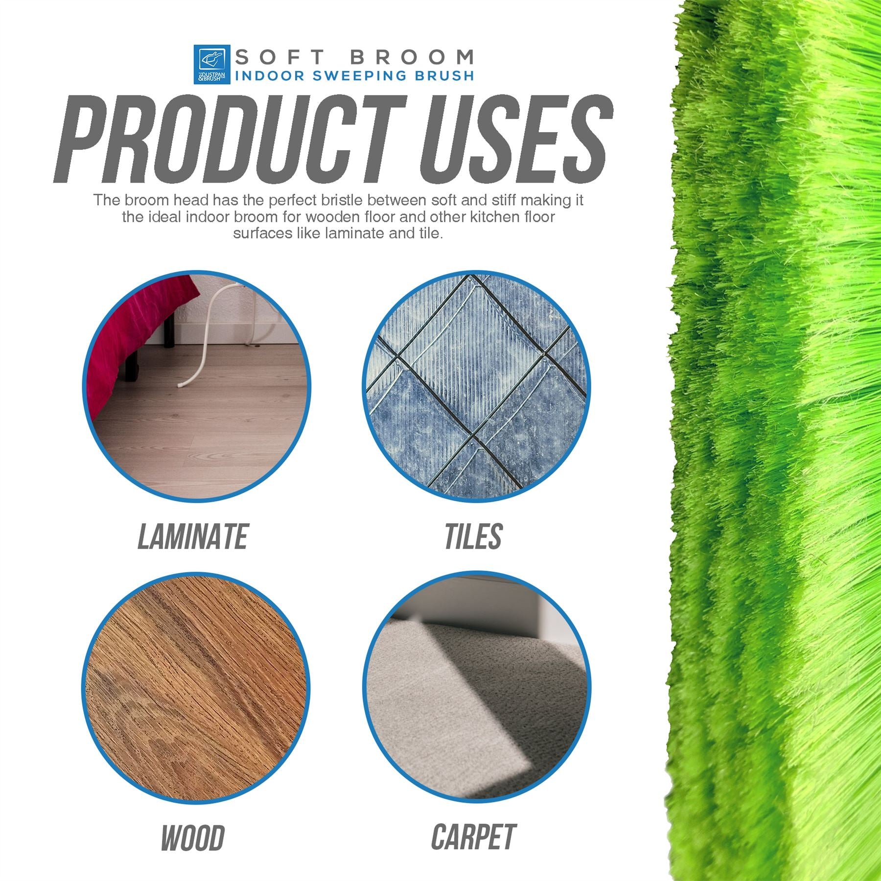 ✔ DESIGNED TO WORK - It may be just a brush but a lot of time and effort goes into making sure the item functions as it should and gives a good customer experience. That is why it has things like a hanging eye for storing - grips on the handle for comfy sweeping - flagged bristles to pick up every last bit of dust - rubberised edges as to not mark your skirting boards or furniture - Your perfect indoor broom in an attractive green and white finish.