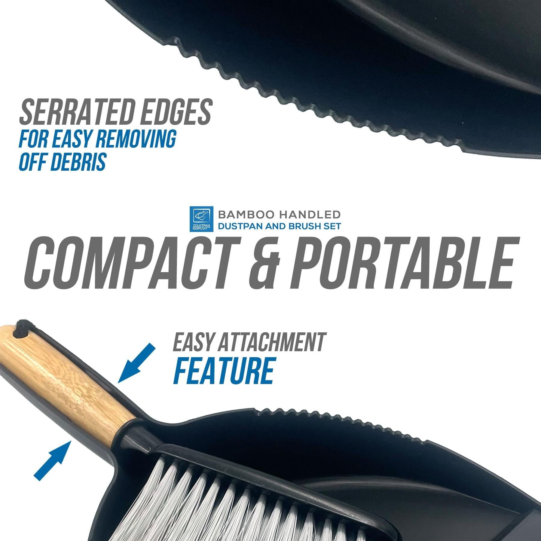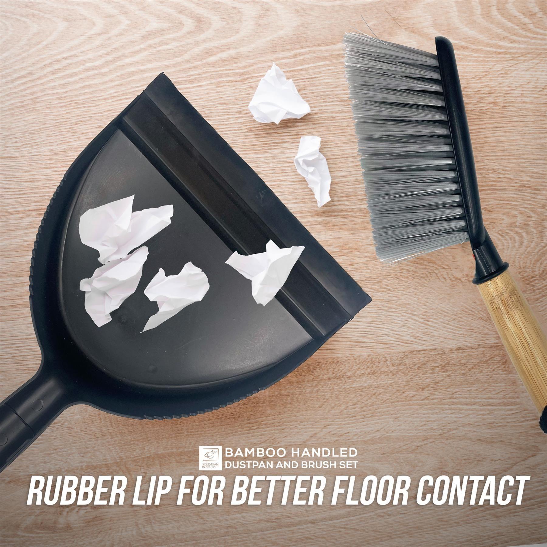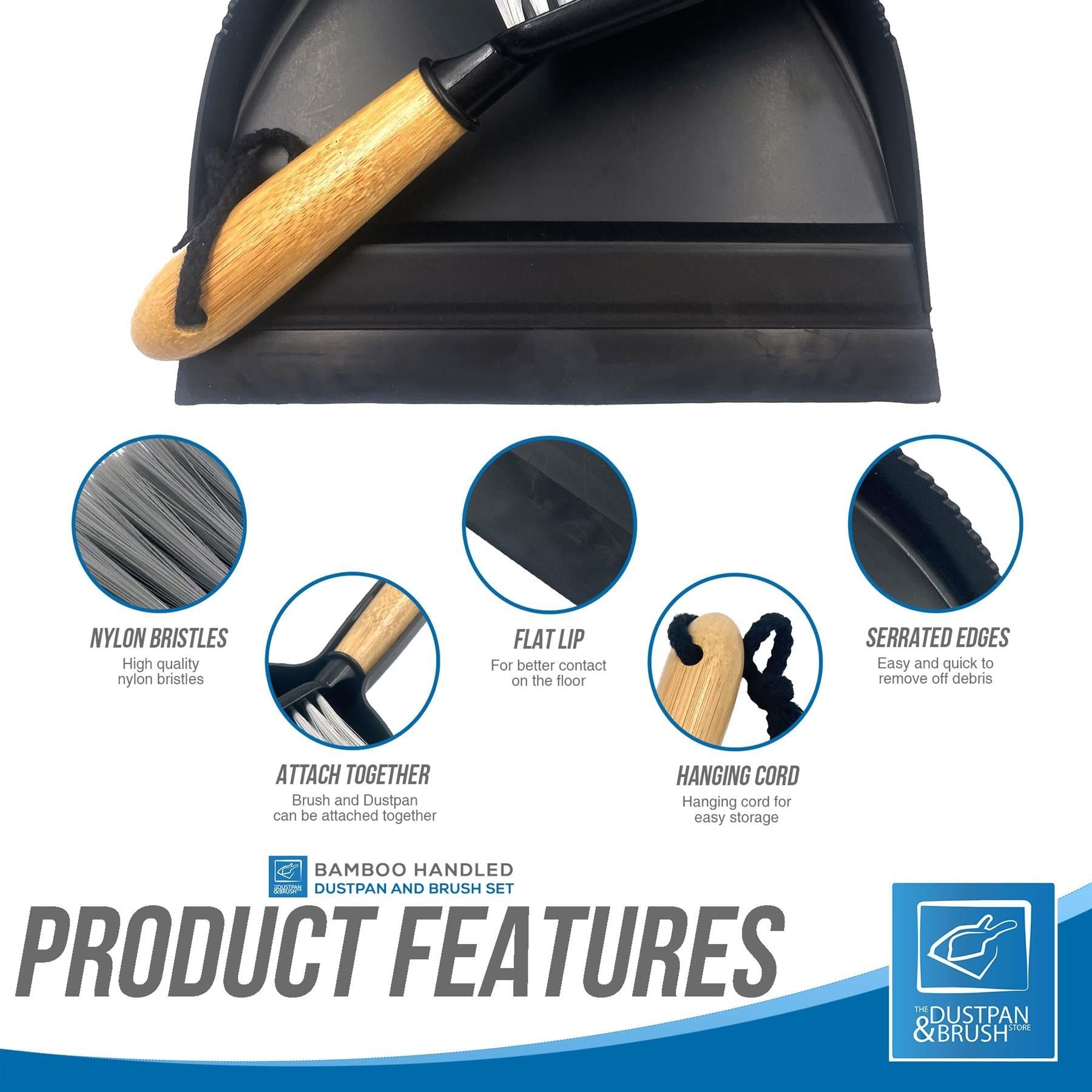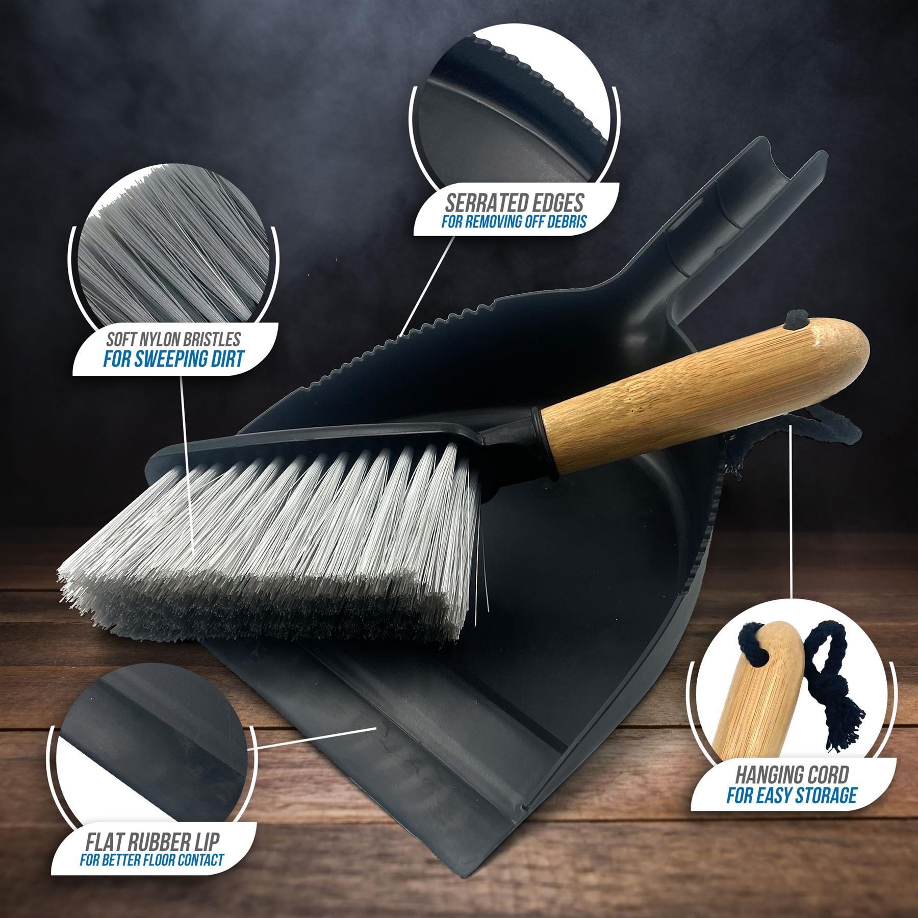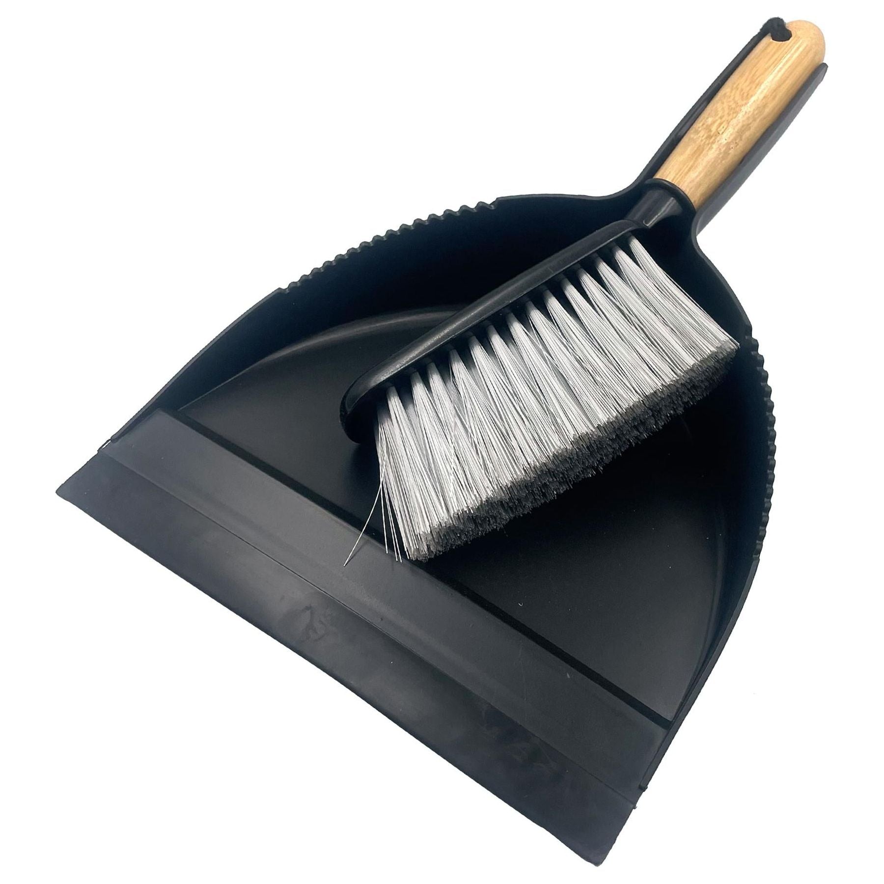 Plastic dustpan with rigid teeth to remove dirt from the bristles.