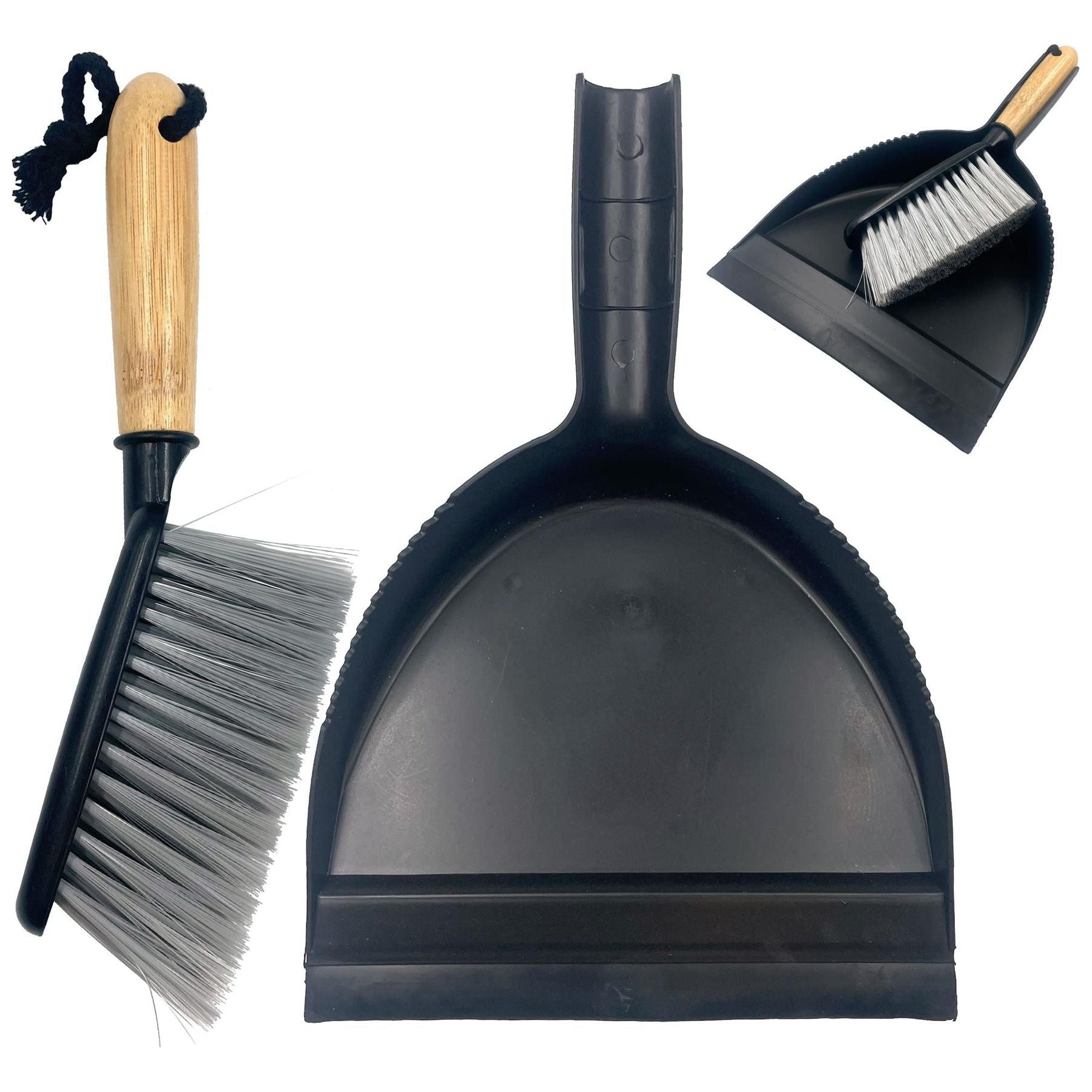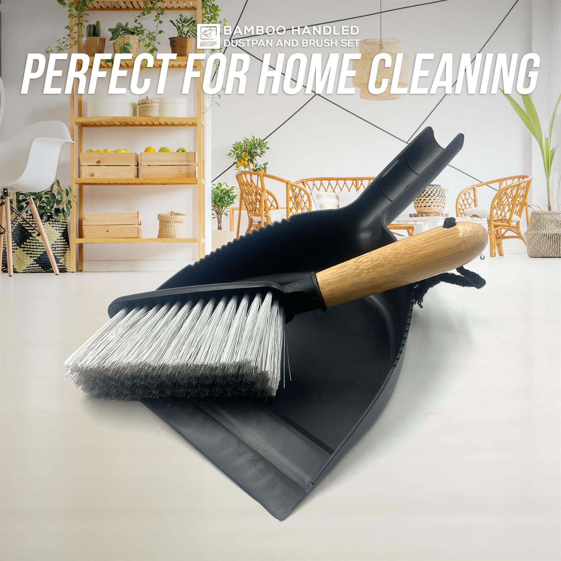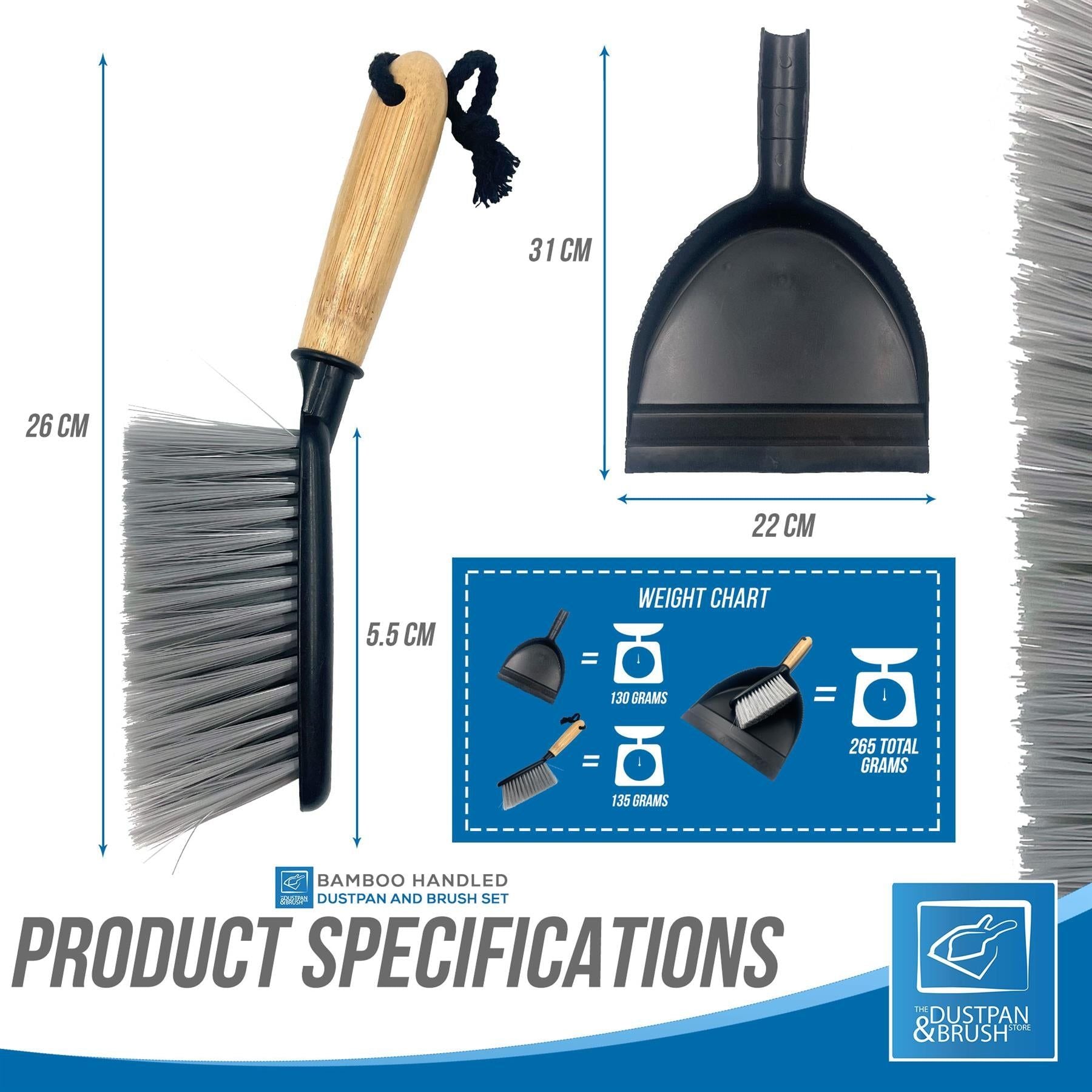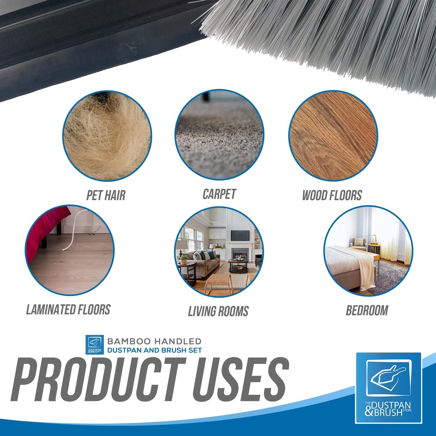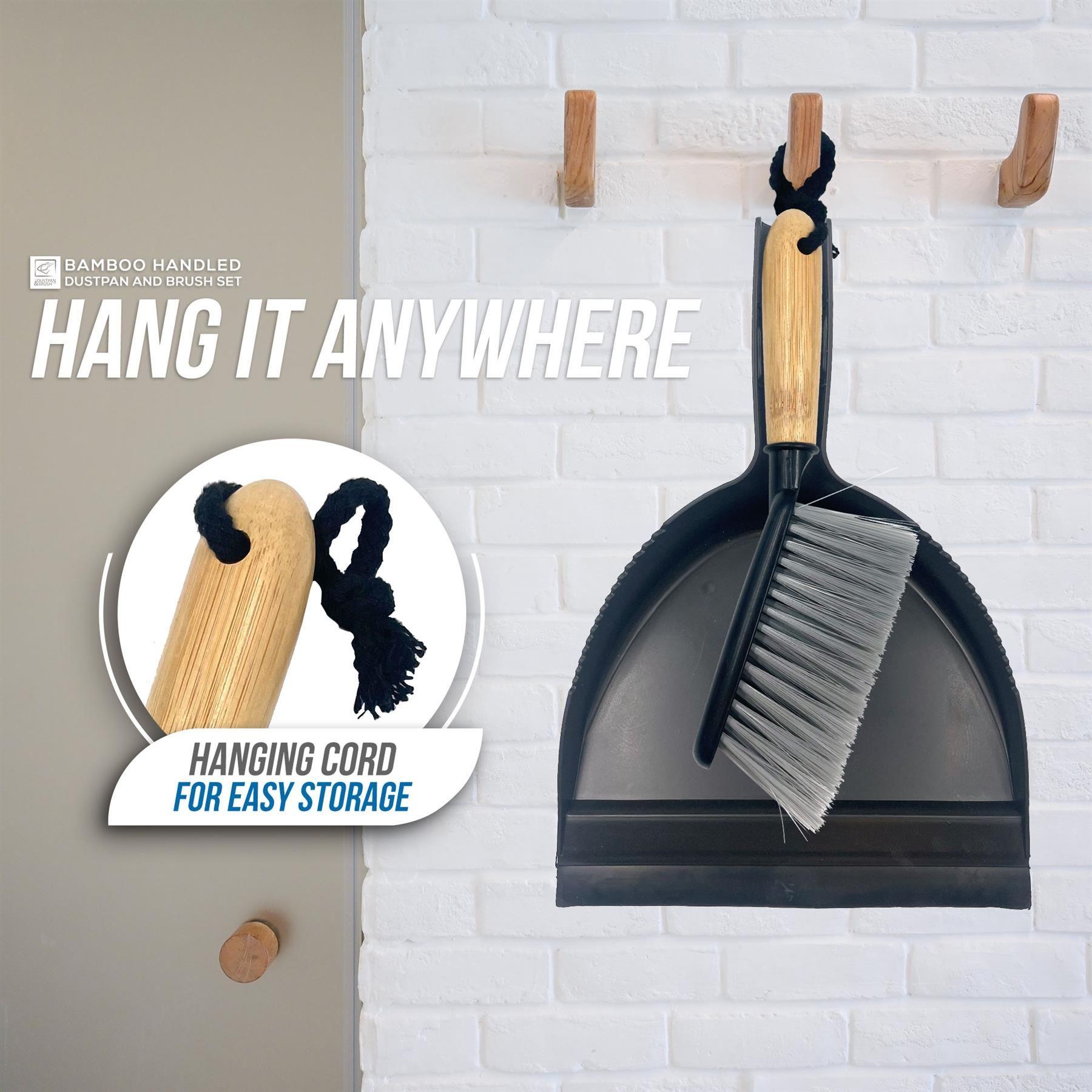 Plastic dustpan with rigid teeth to remove dirt from the bristles.