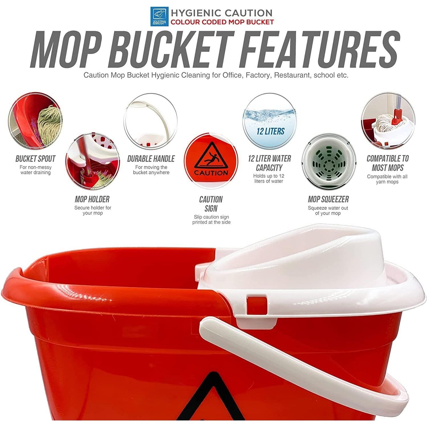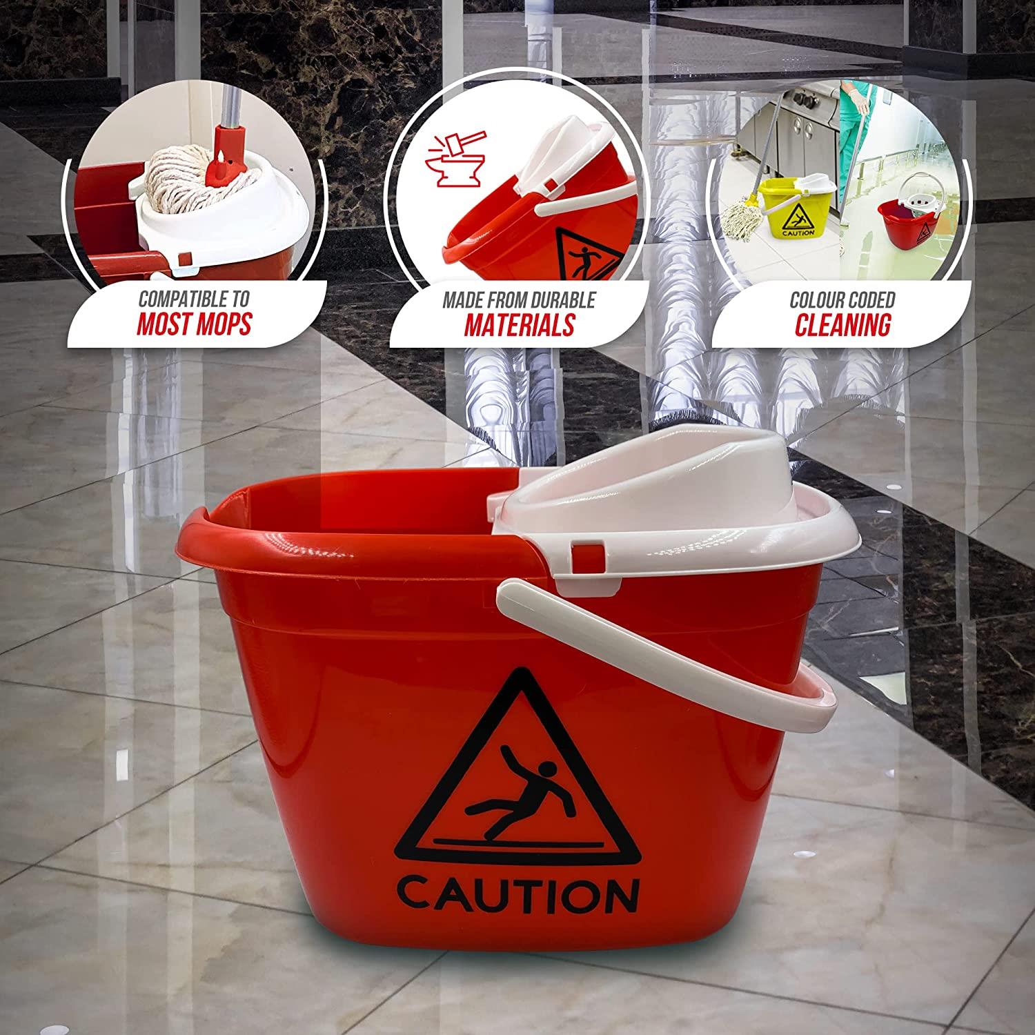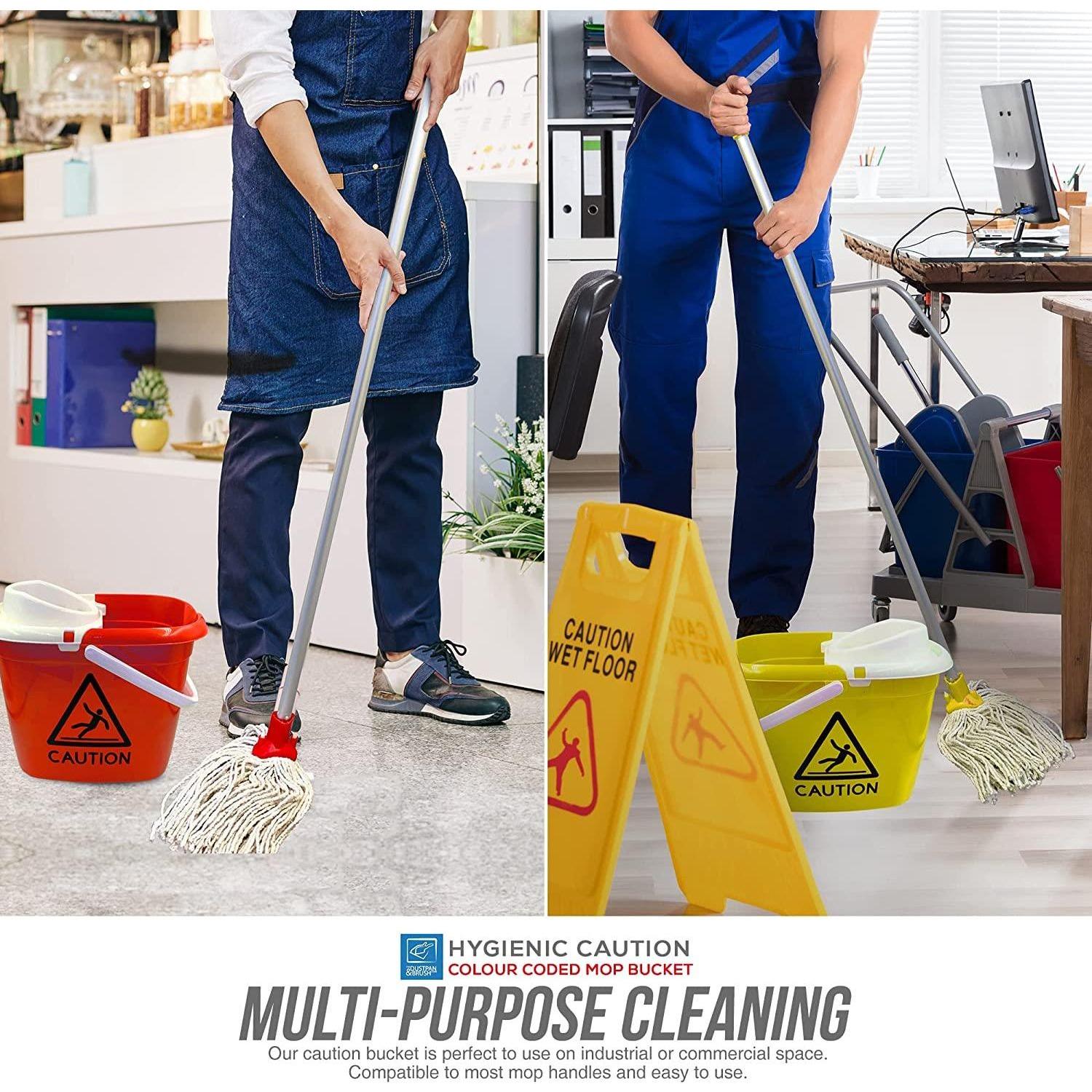 - Red Mop Bucket with Wet Floor Caution Sign – In a colour coded cleaning system, the red bucket mop is used for places with a higher risk of contamination and bacteria such as sanitary fittings, restrooms, toilets, and urinals. Plus, it comes with a large caution wet floor symbol printed on both sides for added safety precaution on slippery floors.