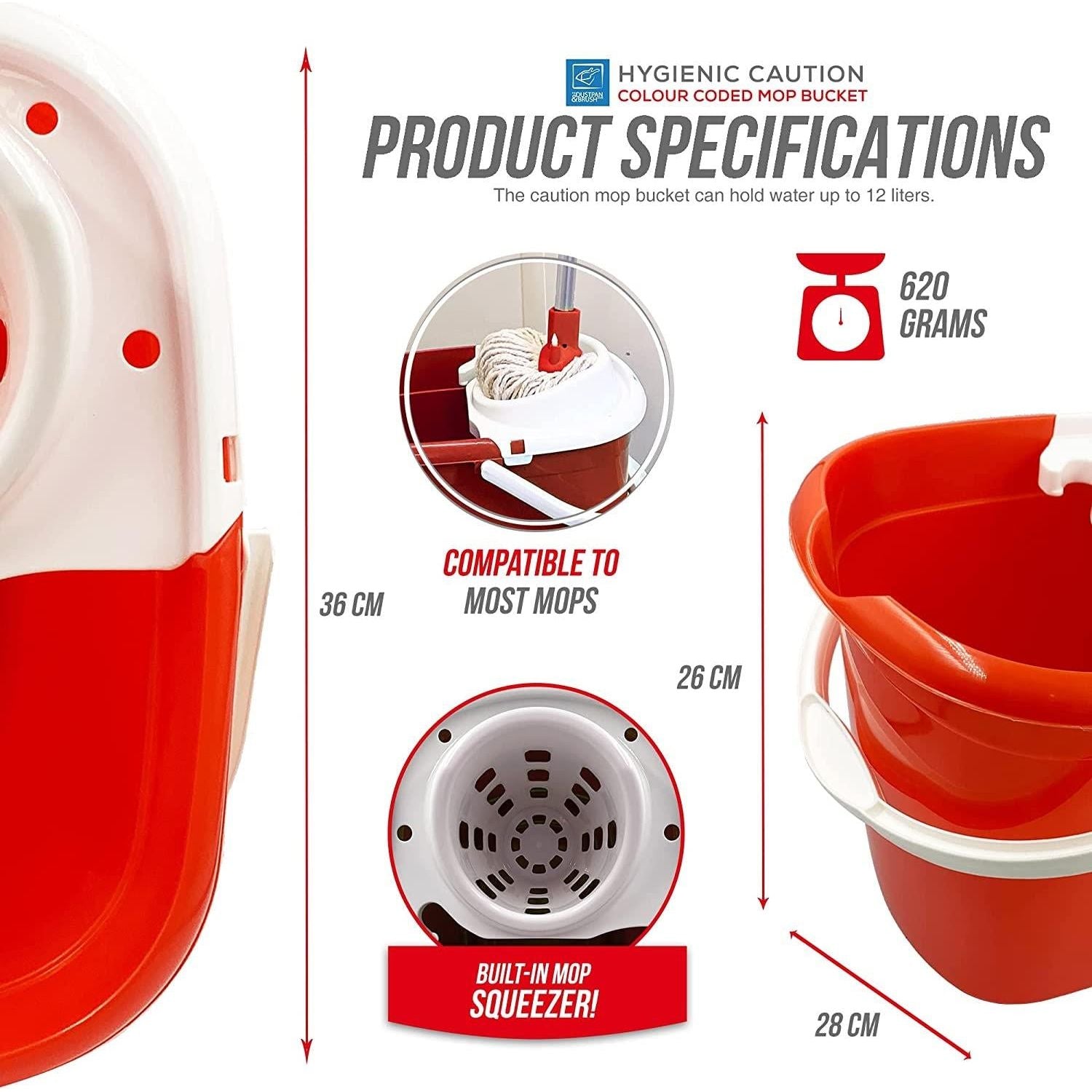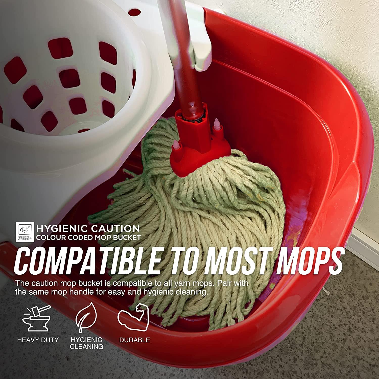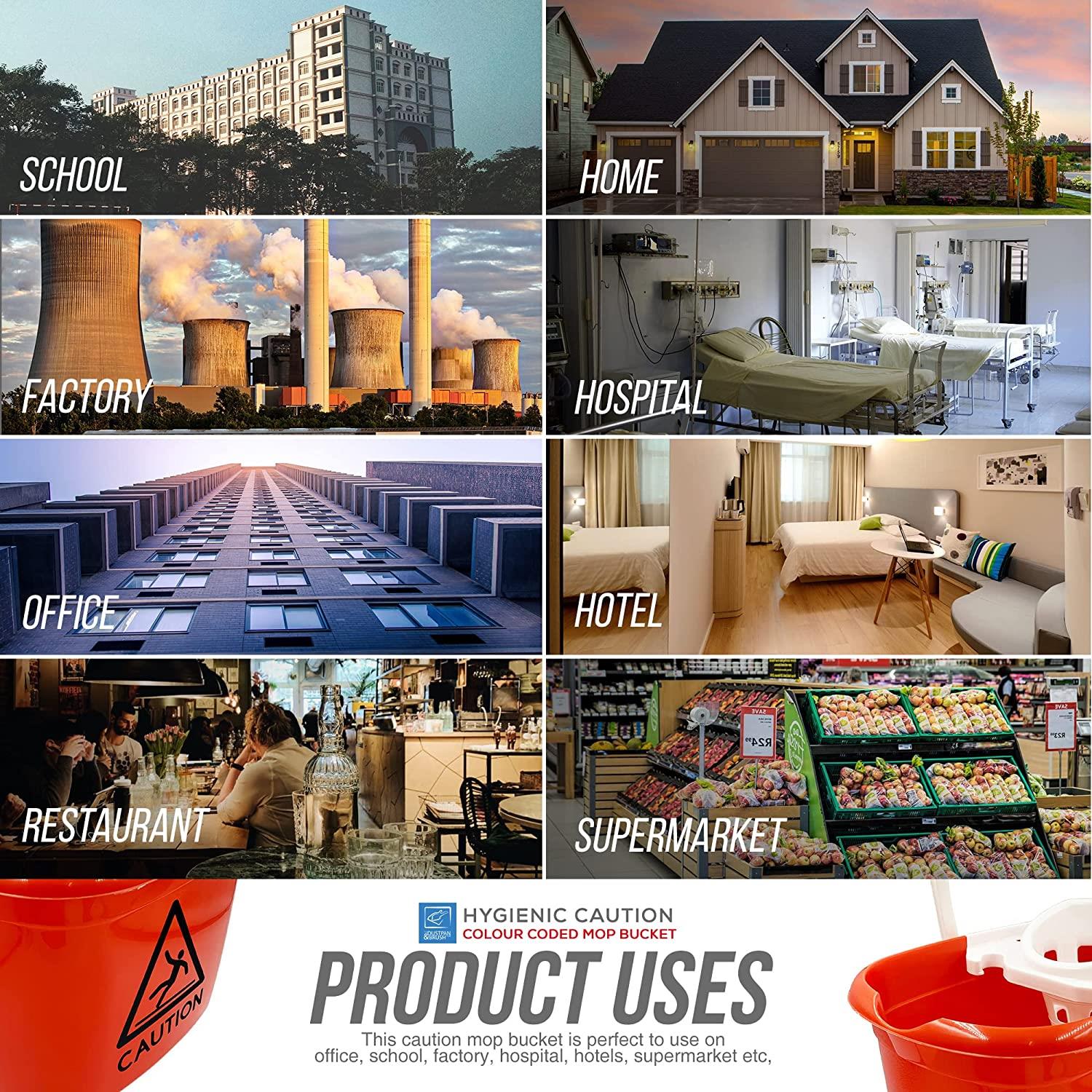- Red Mop Bucket with Wet Floor Caution Sign – In a colour coded cleaning system, the red bucket mop is used for places with a higher risk of contamination and bacteria such as sanitary fittings, restrooms, toilets, and urinals. Plus, it comes with a large caution wet floor symbol printed on both sides for added safety precaution on slippery floors.