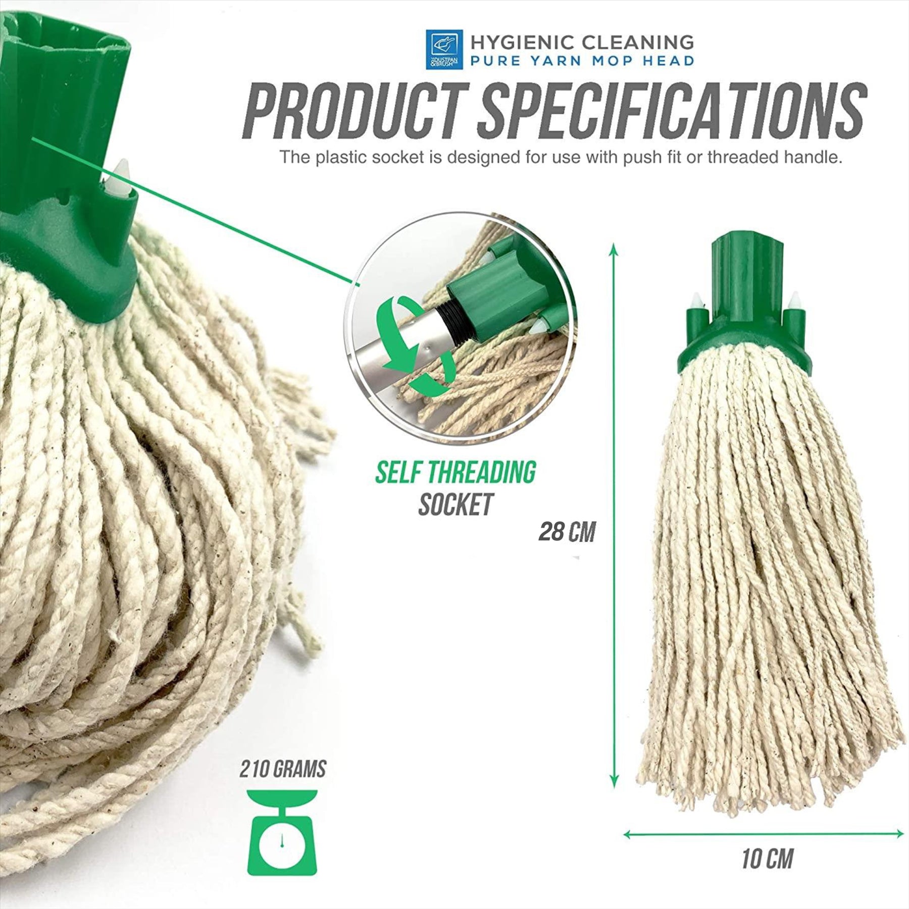 Introducing our traditional cotton yarn string mop – It is made with 23cm traditional braiding pure yarn. This heavy-duty mop head is highly absorbent and ideal for domestic and commercial floor cleaning. It has a universal fitting and delf threading socket. It is designed for general use and suitable for both push-fit and threaded mop head screw-in handle with 22mm diameter.