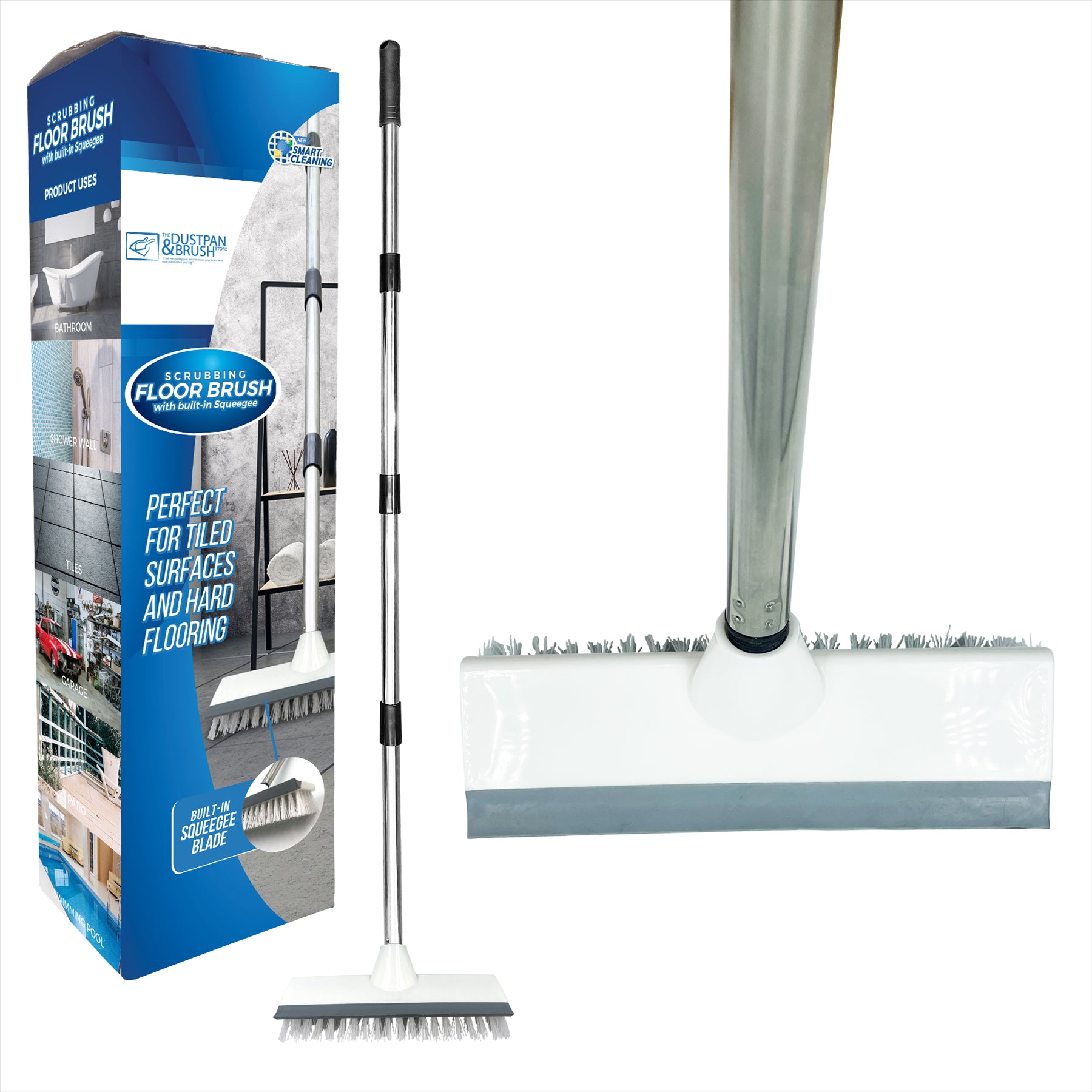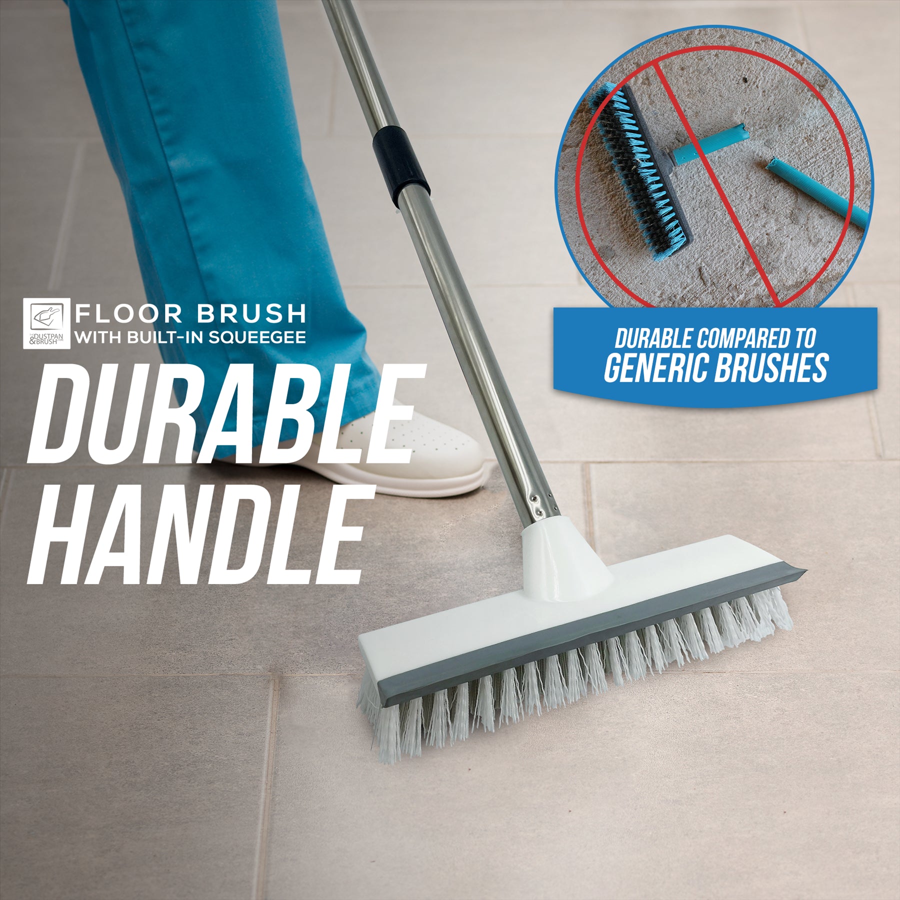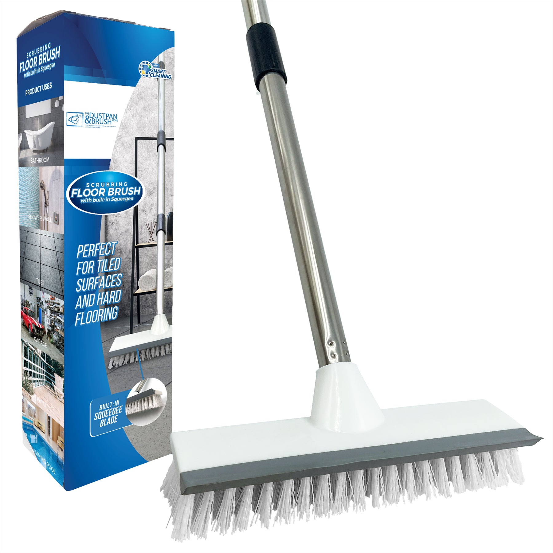 The bristles have a tough long life span to provide a hard scrubbing action to remove ground in dirt. It comes with a built in squeegee to wipe any unwanted spillages, and with it's 4 piece handle it's much easier to use, with no need to bend over to put extra pressure on whilst scrubbing.