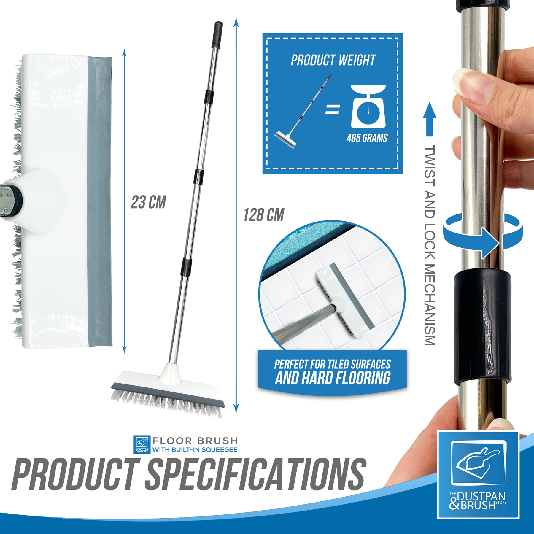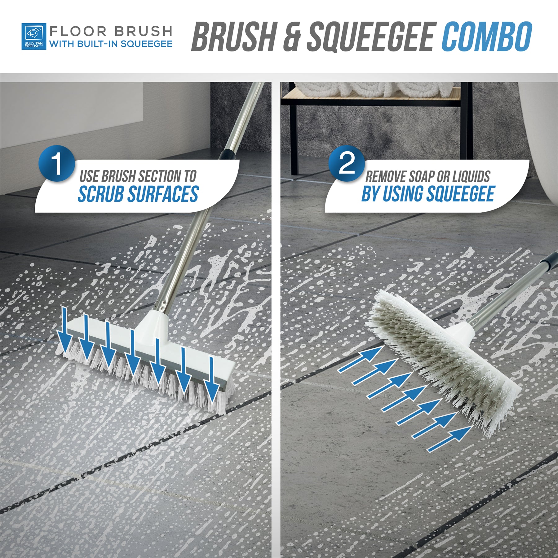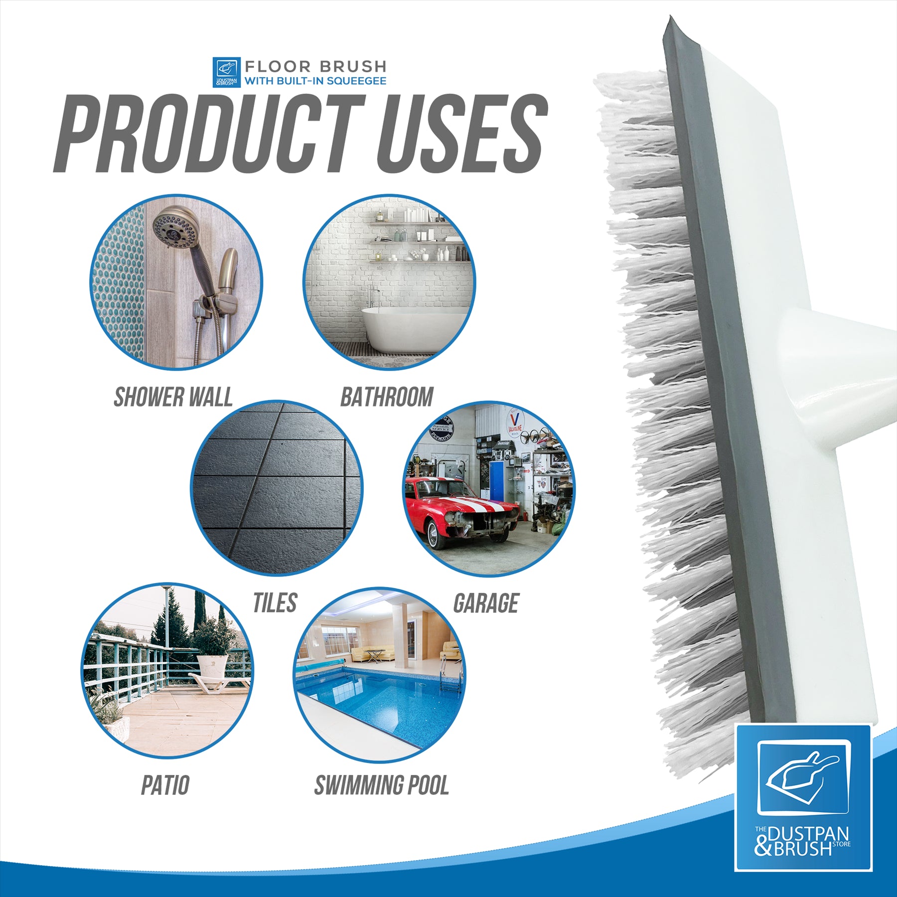 The bristles have a tough long life span to provide a hard scrubbing action to remove ground in dirt. It comes with a built in squeegee to wipe any unwanted spillages, and with it's 4 piece handle it's much easier to use, with no need to bend over to put extra pressure on whilst scrubbing.