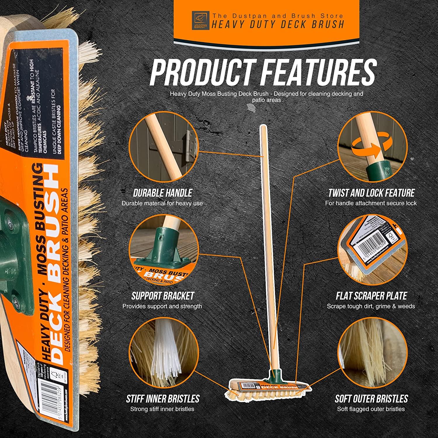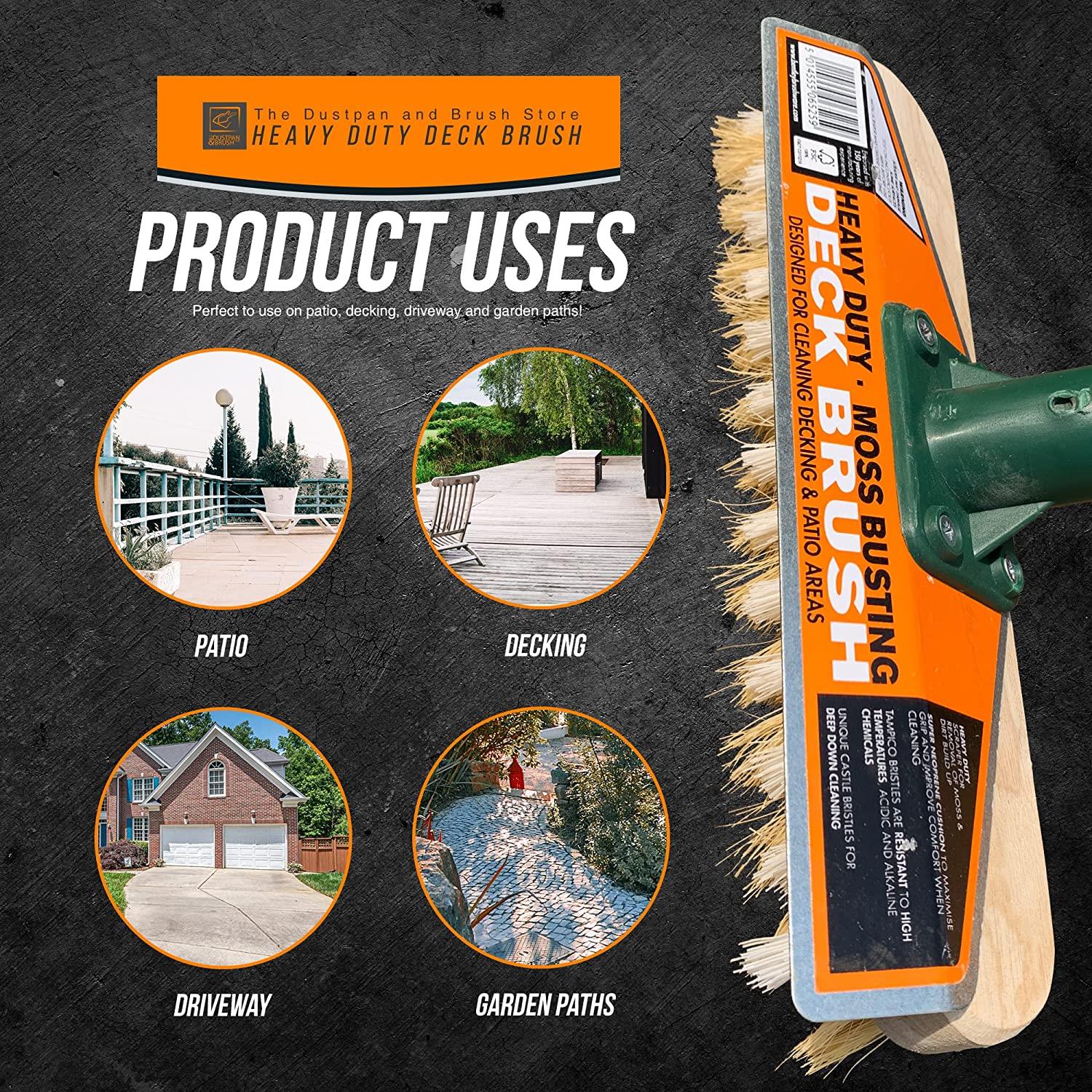 - A flat metal plate, attached to the head of the decking scrubbing brush, is designed for easy removal of tough dirt, grime, and weeds.