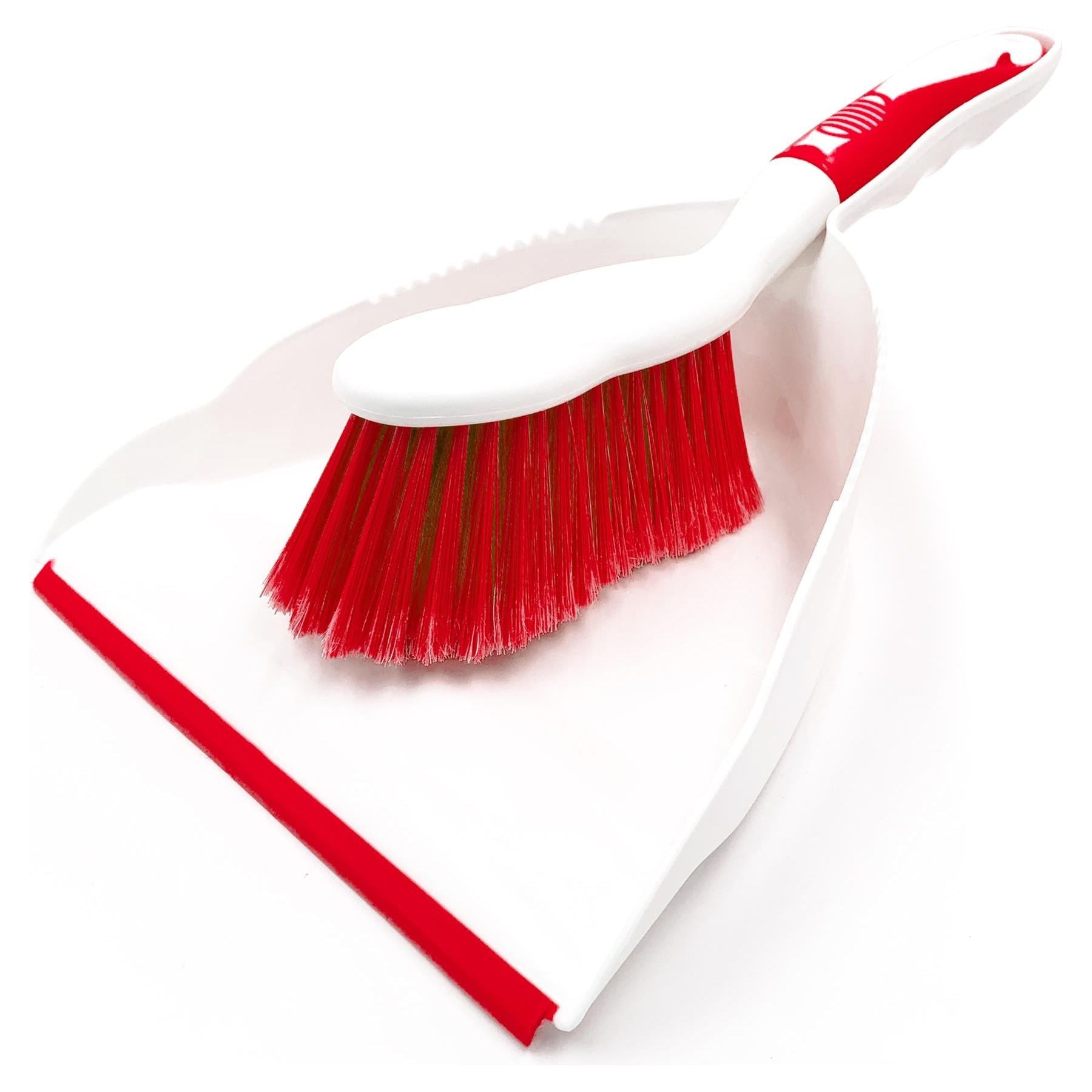 Plastic dustpan with rigid teeth to remove dirt from the bristles.