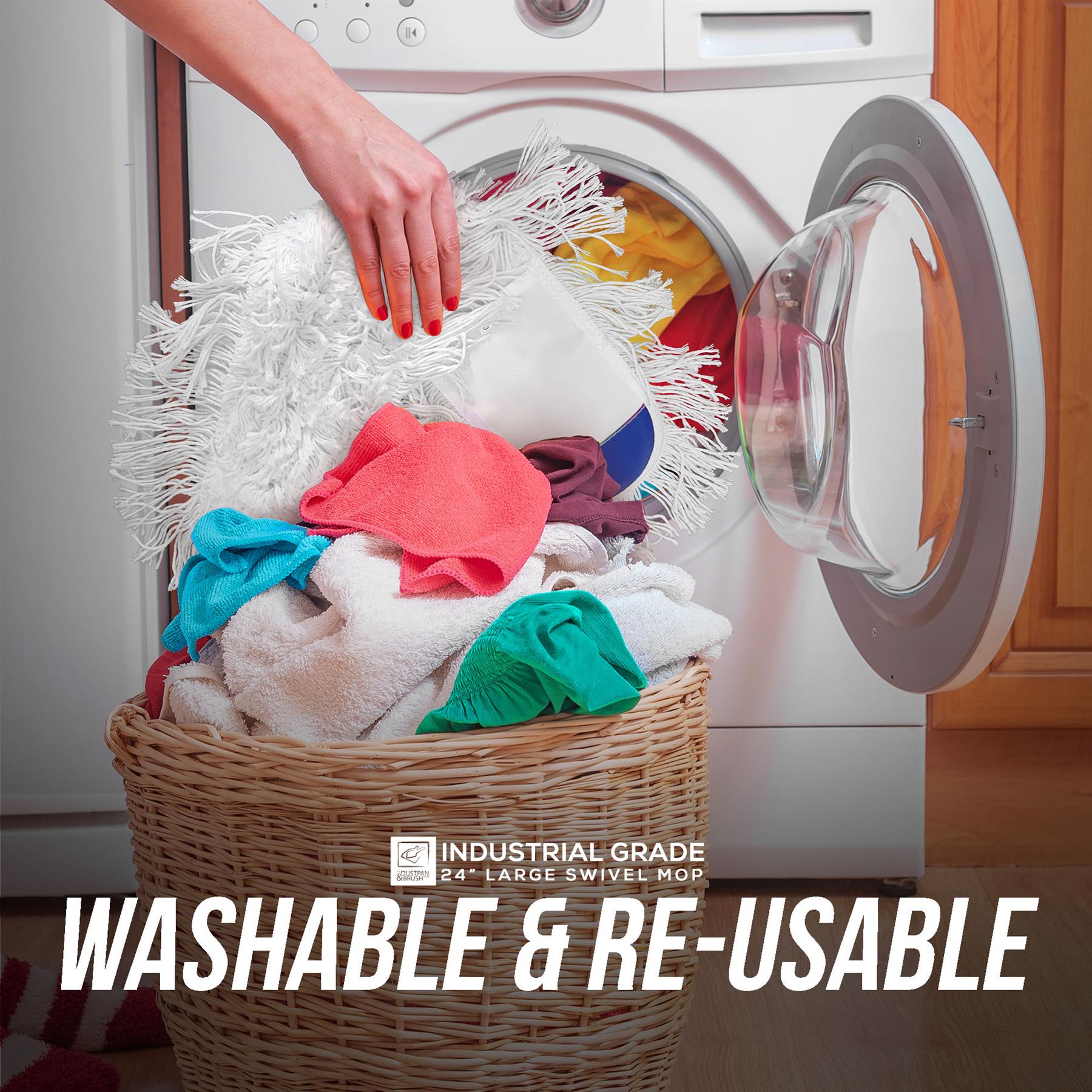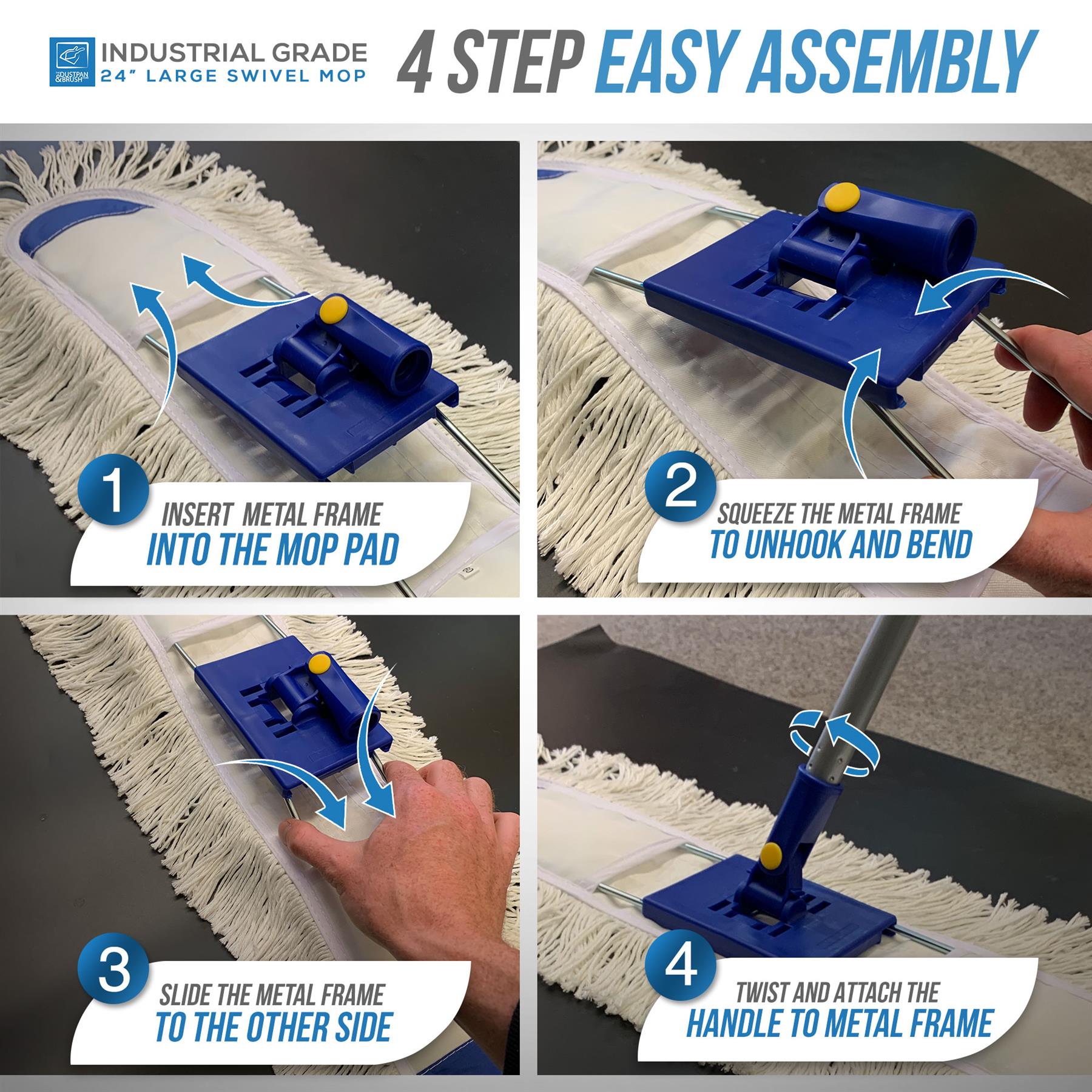 Easy to attach - Squeeze and unhook, then slide metal frame inside mop