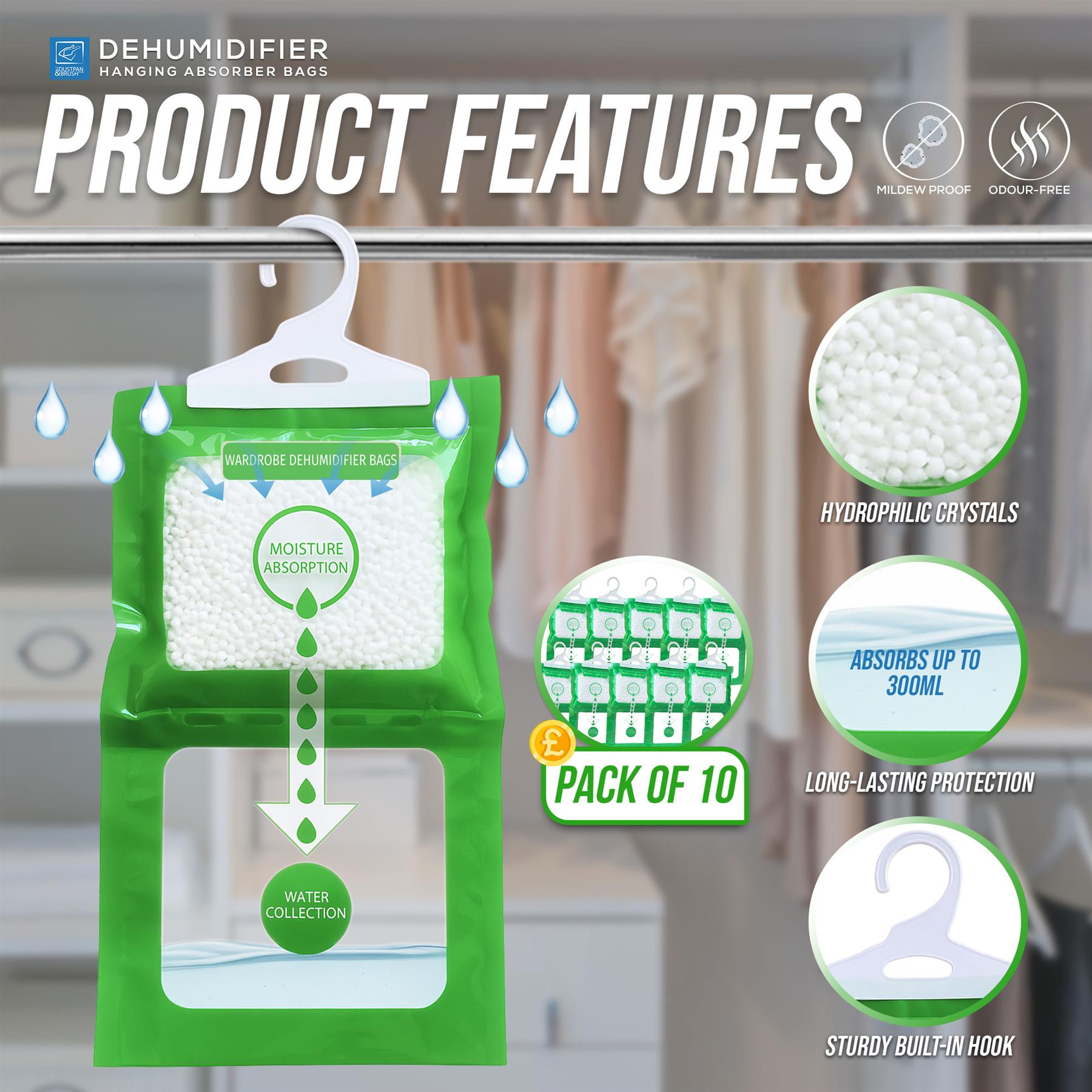 Keep clothes fresh, dry, and protected with these easy-to-use hanging dehumidifier bags. Each bag absorbs excess moisture and collects it in the lower chamber, helping prevent damp, mould, and musty odours in wardrobes and enclosed spaces. Simply hang on any rail and let the moisture-absorbing crystals do the work.