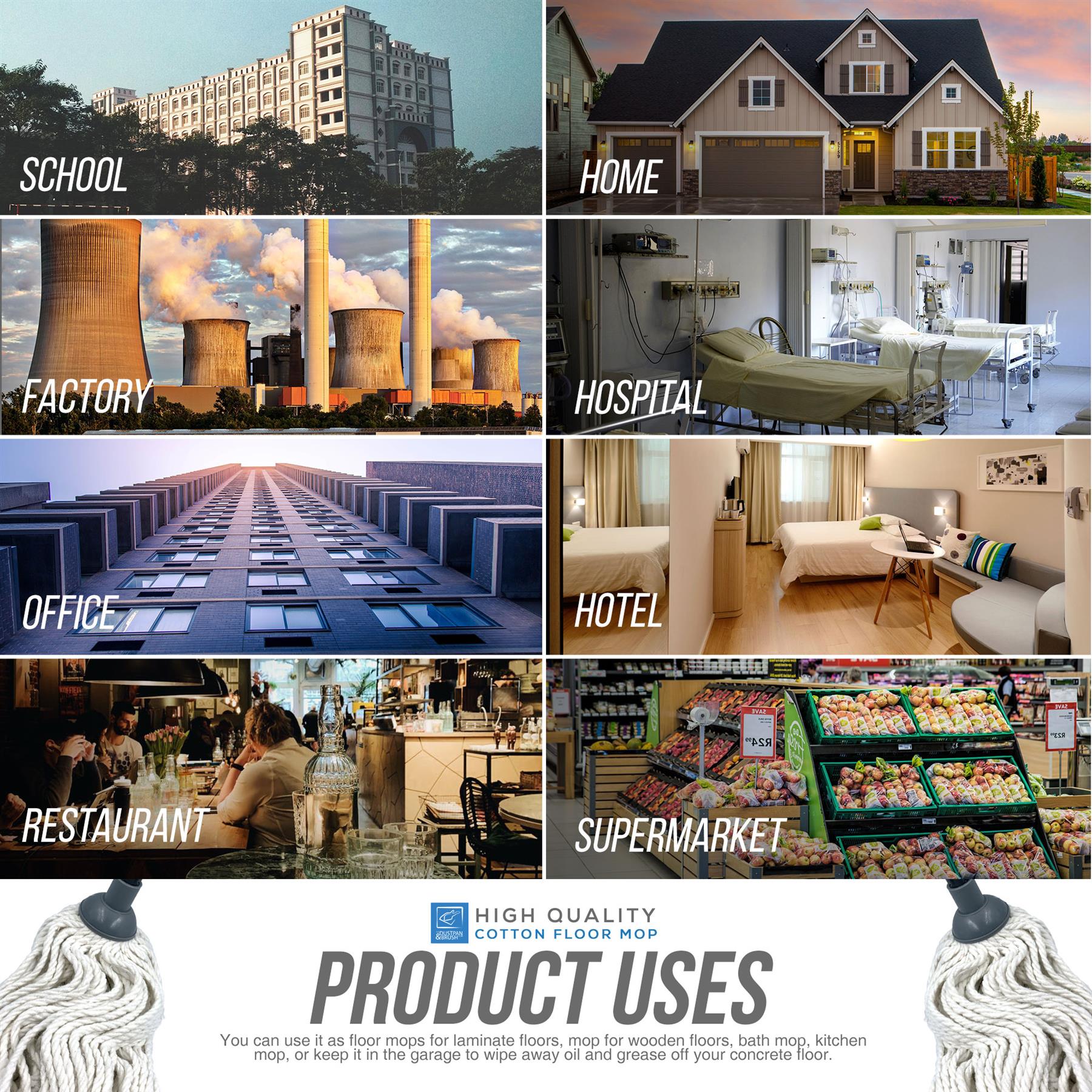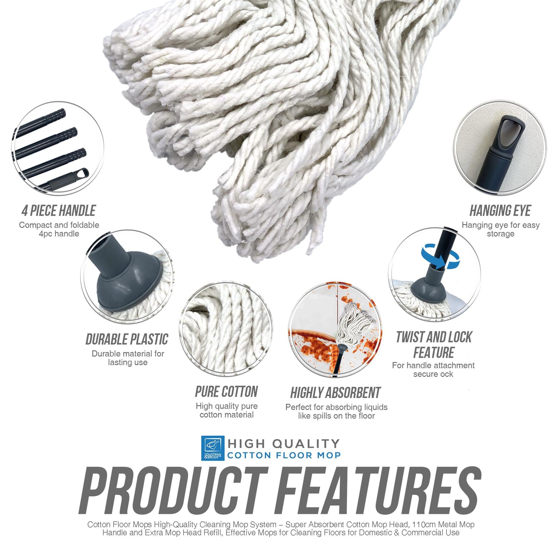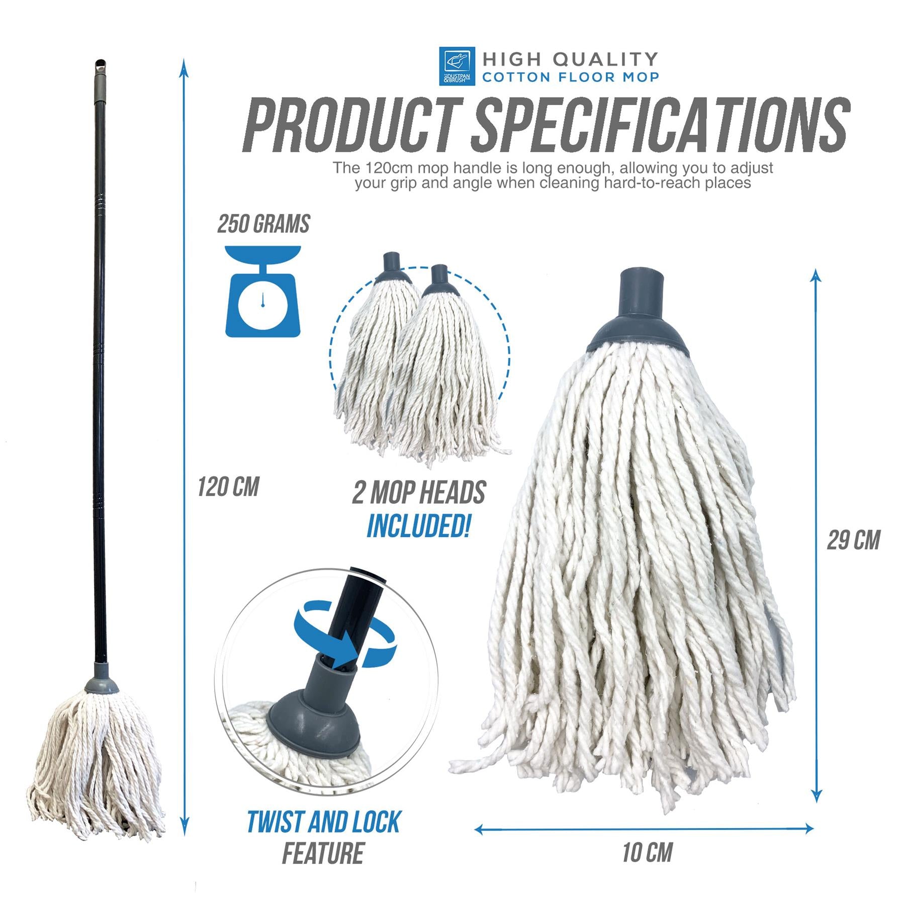 When it comes to cleaning and making your floors shine, our cotton mops do just the job! Cotton mop heads are a great option because of their absorbent properties and excellent scrubbing power, and can do quick work of any spills. Our mop comes with a long, lightweight, metal handle, eliminating the need for you to bend down when cleaning floors. This does not only make it convenient for anyone using it, but more importantly, for those with back problems.