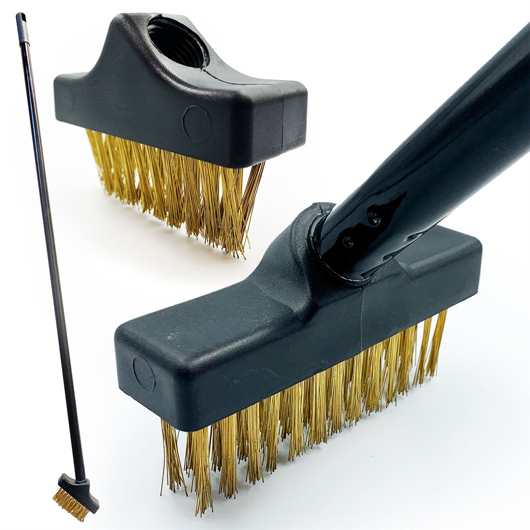 Set includes angled weed brush head for getting inbetween the cracks of paving.