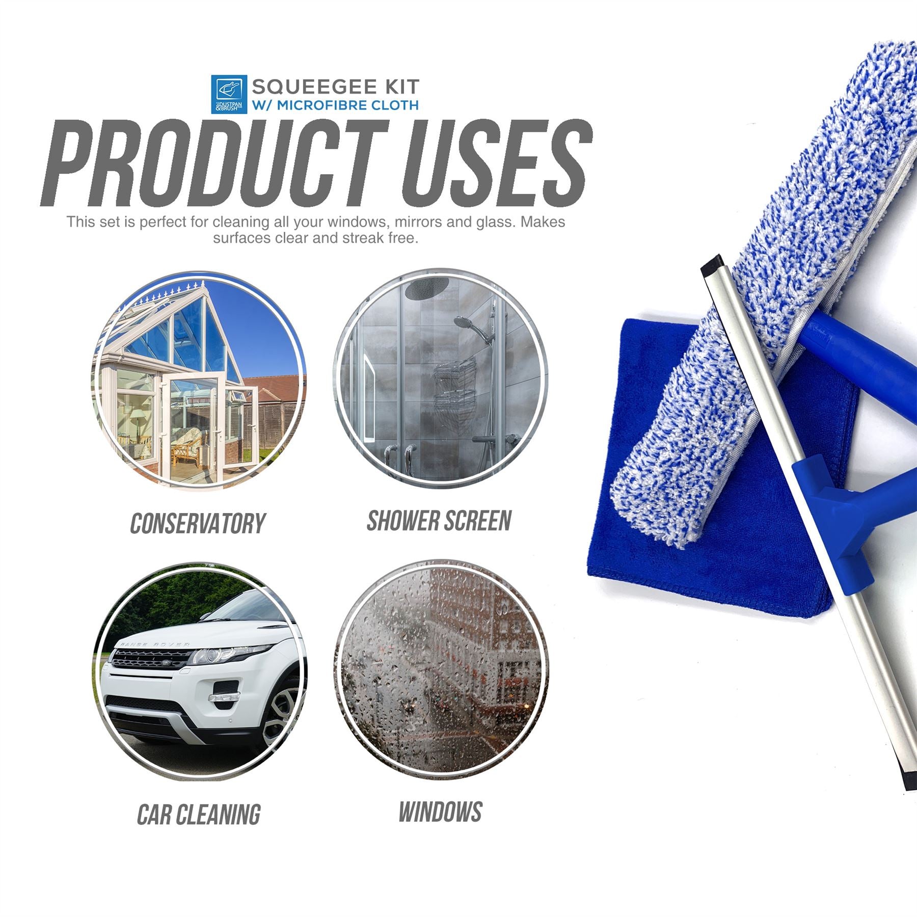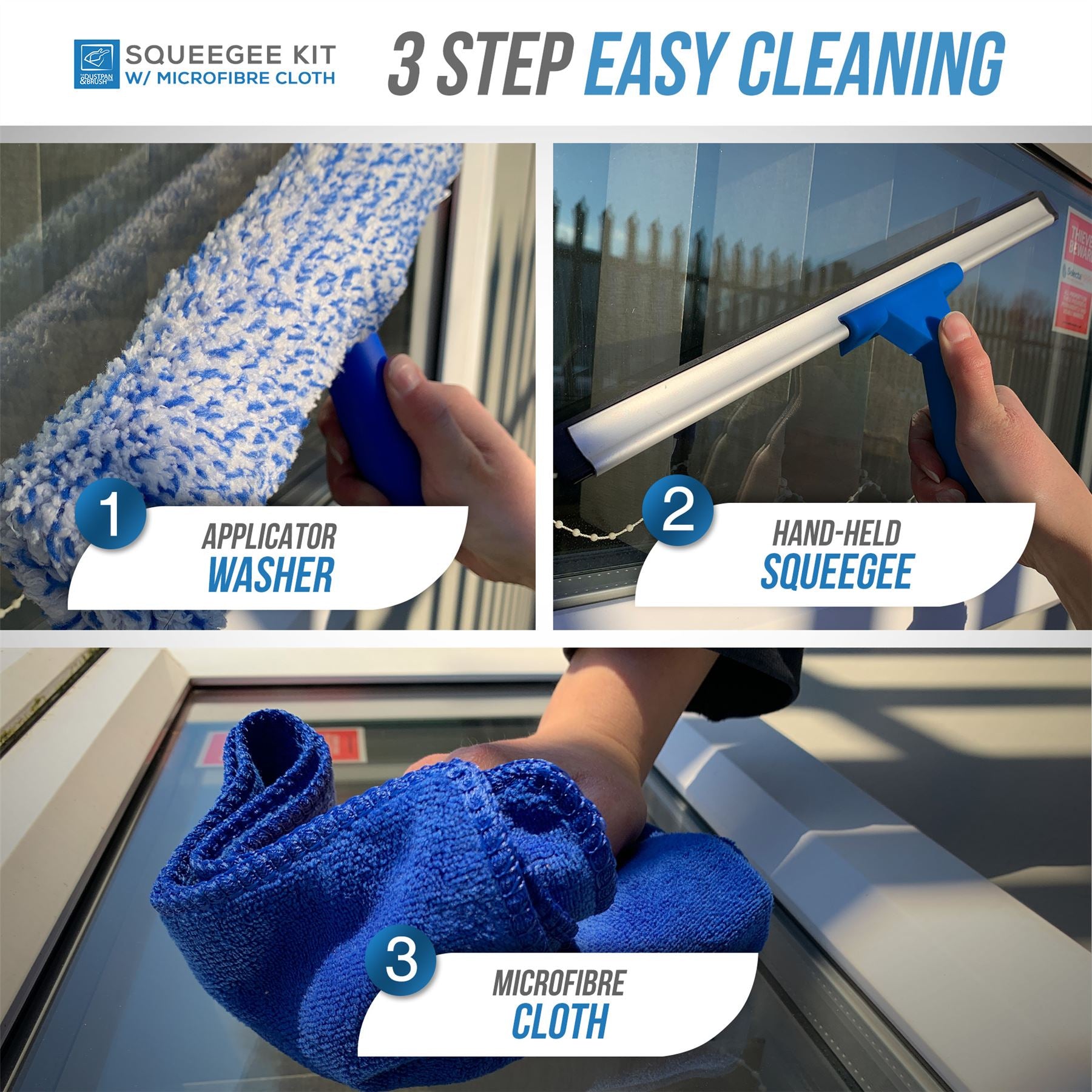 Wash your windows with the applicator, dry and clear the window with the squeegee and then buff clean and remove any streaks from the edges with the microfibre cloth.